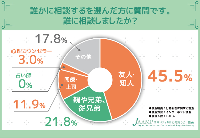 【行動心理カウンセラーの資格獲得は日本メディカル心理セラピー協会(JAAMP)】対人関係の悩みがある人は100%!相談相手は友人・知人が多いという結果に