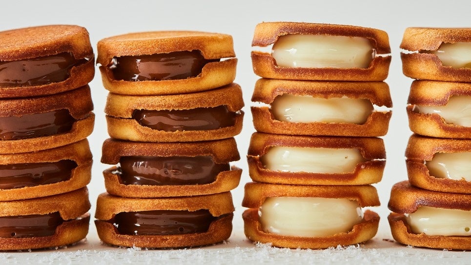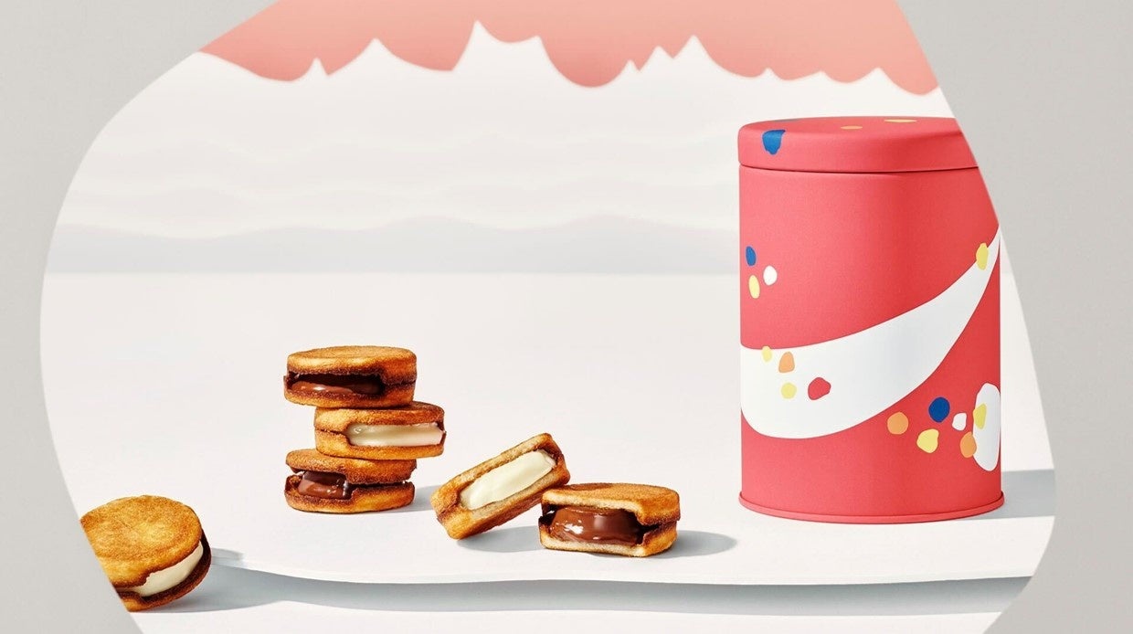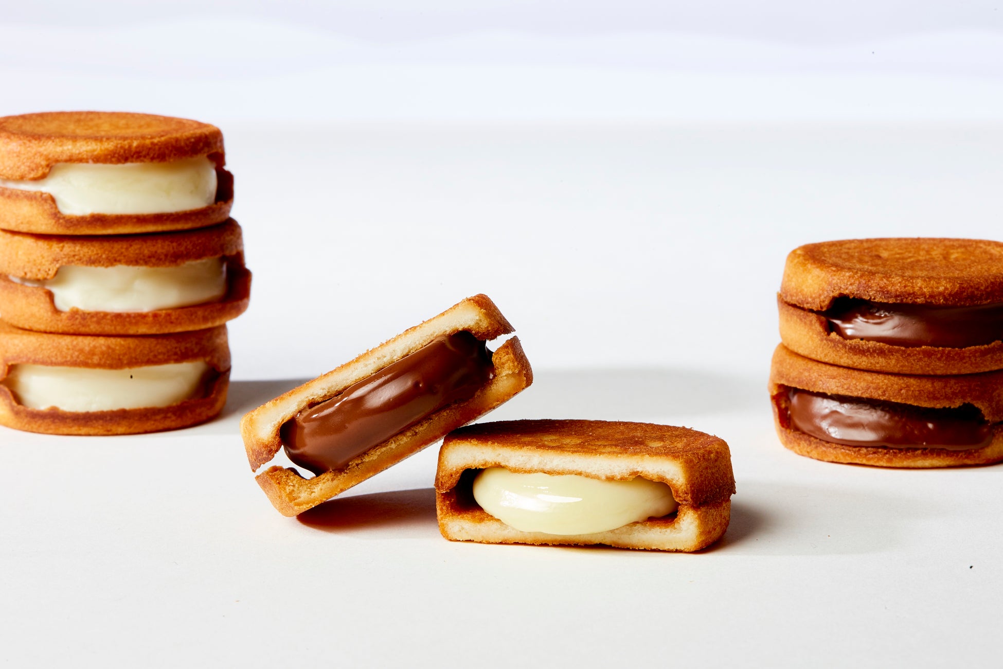 熱した鉄板で挟み焼きすることで生まれる、ラングドシャクッキーのカリカリ感と生チョコレートのなめらかさの両方を実現した、生チョコレートサンドクッキー。