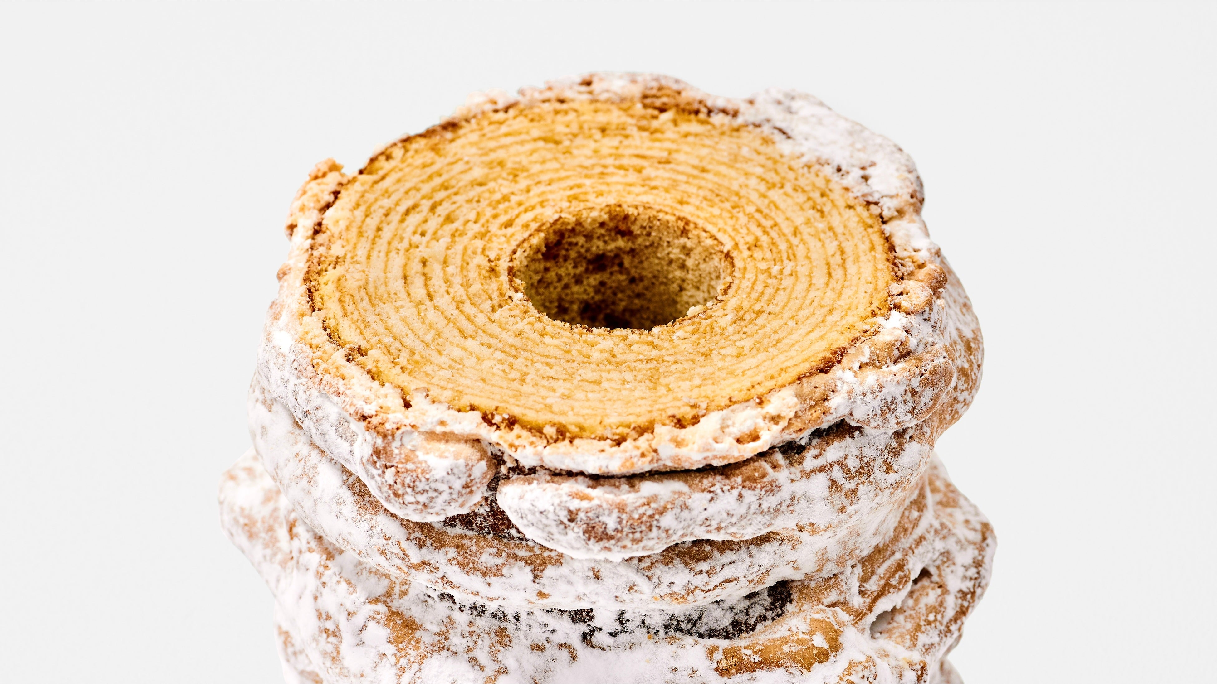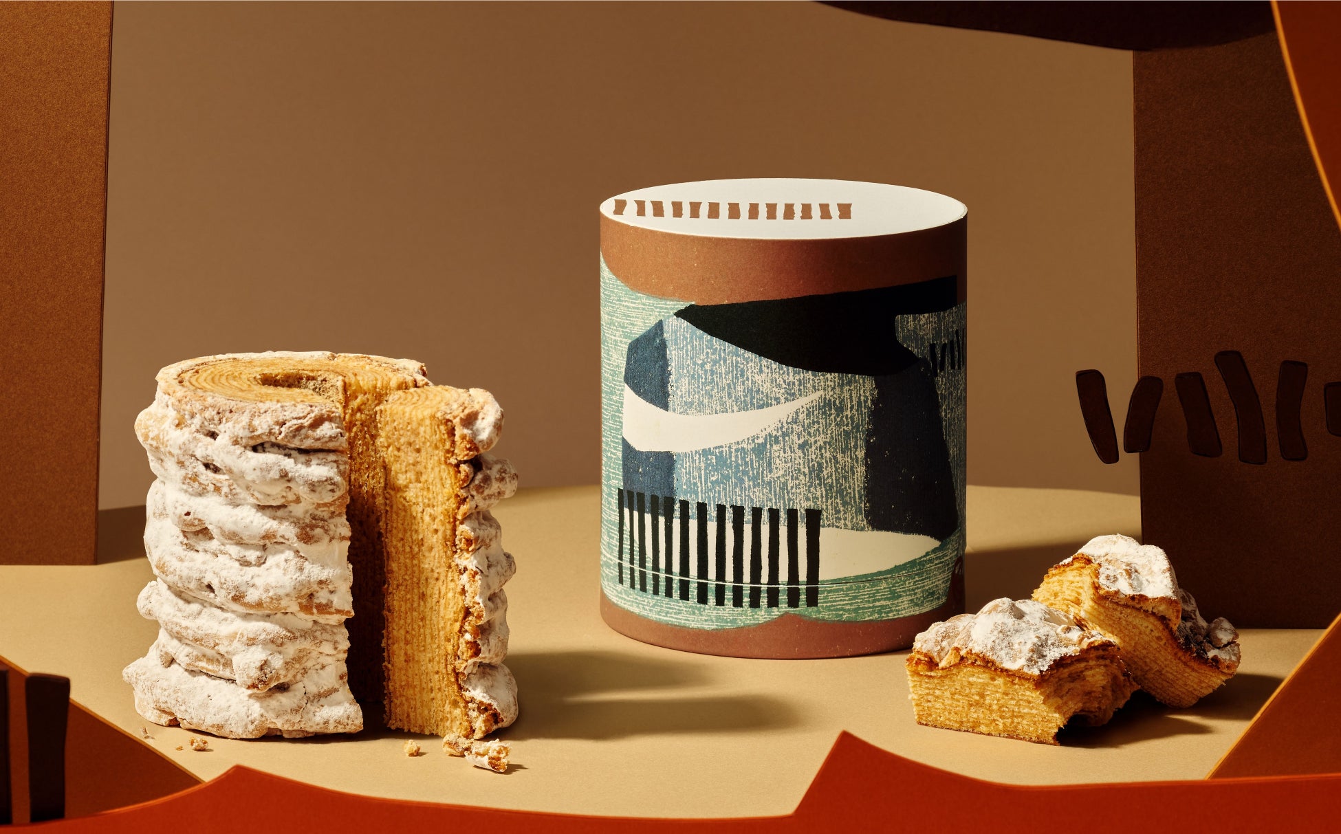 バター香る生地の層の外側にマカロン生地で包み2度焼きをすることで、しっとりとしたほどける食感とザクザクの食感を同時に楽しめる、新食感ハイブリットスイーツ、マカロンバームクーヘン。