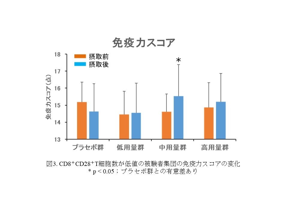 【結果】「カスピ海乳酸菌」を含む錠剤の継続摂取によりすべての群で排便日数(図1)、排便回数の有意な改善が認められた。またプラセボ群と比べて中用量群で乳酸菌群数(図2)が、低用量群でビフィズス菌数の変化量がそれぞれ有意に増加したことから整腸作用を介して排便状況が改善することが示唆された。血中の免疫細胞数に関し、中用量群でのナイーブT細胞(※7)数が有意に増加したものの、他の免疫指標や感冒症状に関する体調アンケートの有意な改善は認められなかった。しかしながら、加齢に伴い低下することが報告されているCD8+CD28+ T細胞数が全被験者の平均値未満の被験者を集めて層別解析を行ったところ、プラセボ群と比べて中用量群でナイーブT細胞数およびCD8+CD28+T細胞数が有意に増加し、免疫力スコア(図3)の改善が認められた。