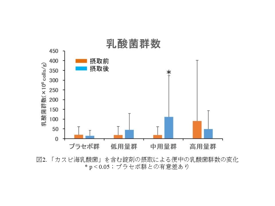 【方法】疲れやすく、便秘傾向の20~71歳の男女88名を4つのグループに分け、それぞれに「カスピ海乳酸菌」を含まない錠剤(プラセボ群)、50 mg含む錠剤(低用量群)、75 mg含む錠剤(中用量群)、100 mg含む錠剤(高用量群)を4週間摂取してもらった。摂取前と摂取4週間後に、排便状況や便中の腸内細菌数、血中の免疫細胞数や抗体濃度を測定した。