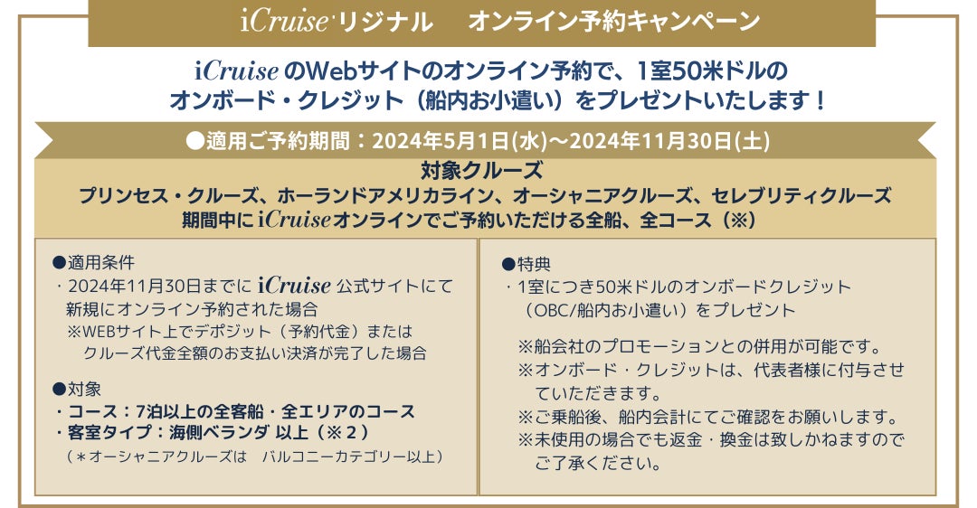 期間中iCruise のオンライン予約を通じて、対象のクルーズをご予約いただくと、1室あたり50米ドルの、オンボードクレジット(船内おこづかい)がついてきます。対象の予約期間は、2024年11月30日(土)まで。