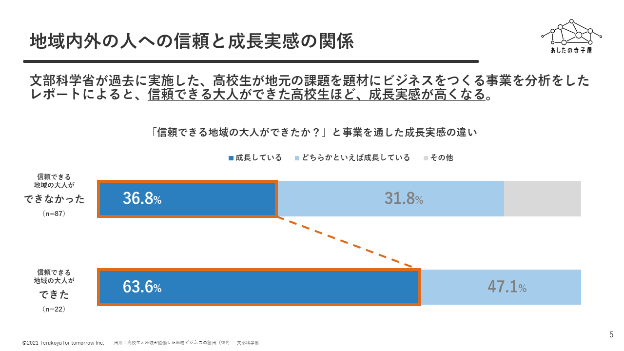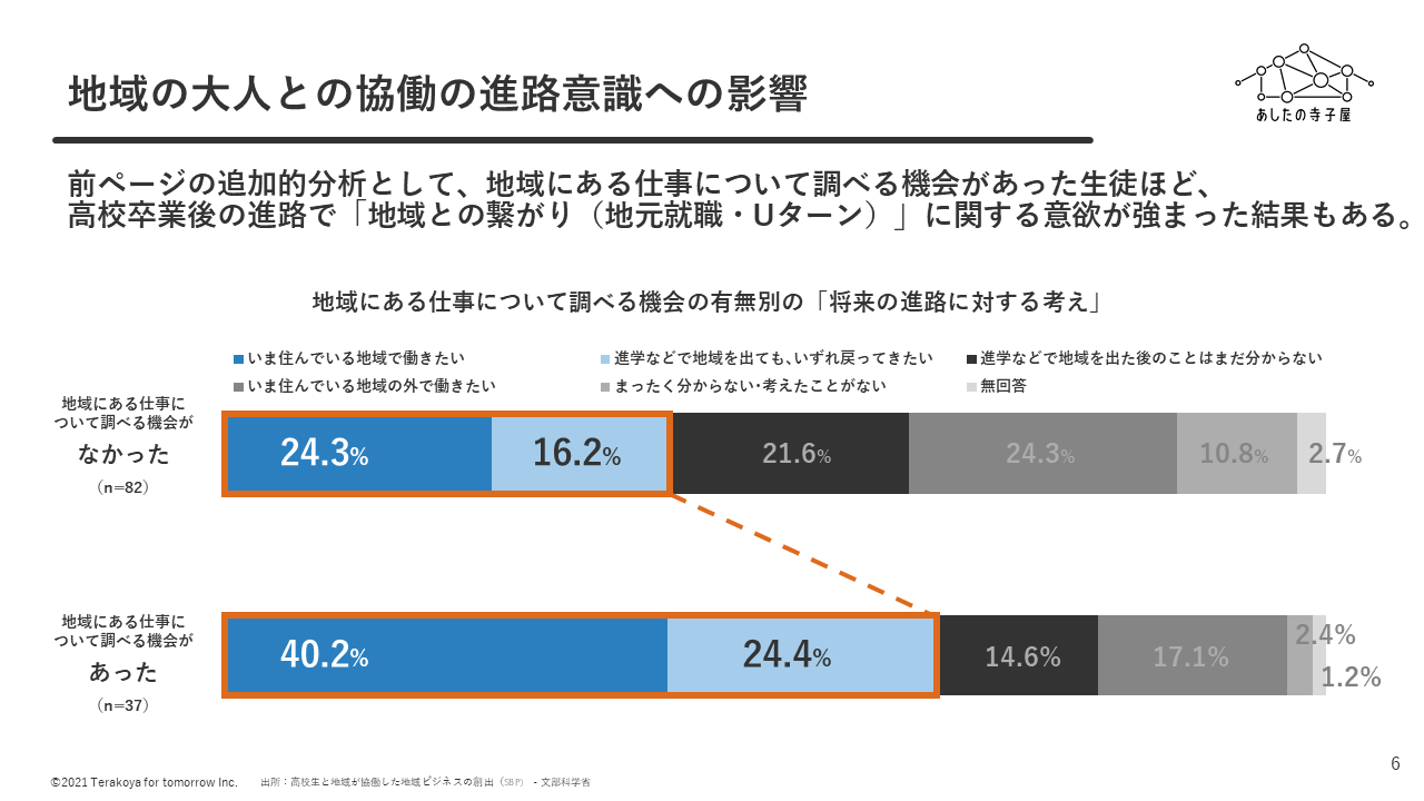 ■「学外の年上の人」について、地域の中で暮らす大人との交流という観点で少し深堀して考えてみます。文部科学省が過去に実施した、高校生が地元の課題を題材にビジネスを創るプロジェクト(SBP)の分析レポートによると、プロジェクトを通して地域に信頼できる大人ができた高校生ほど、成長実感が高くなるという結果や、地域にある仕事について調べる機会があった生徒ほど、高校卒業後の進路で「地域との繋がり(地元就職・Uターン)」に関する意欲が強まるという結果が得られています。ここから、地域の中で働く大人やその仕事と触れ合う機会を創ることが、結果的に人づくりだけでなく、将来的な地域の人の流れづくり/関係人口創出にもつながることを示唆しています。