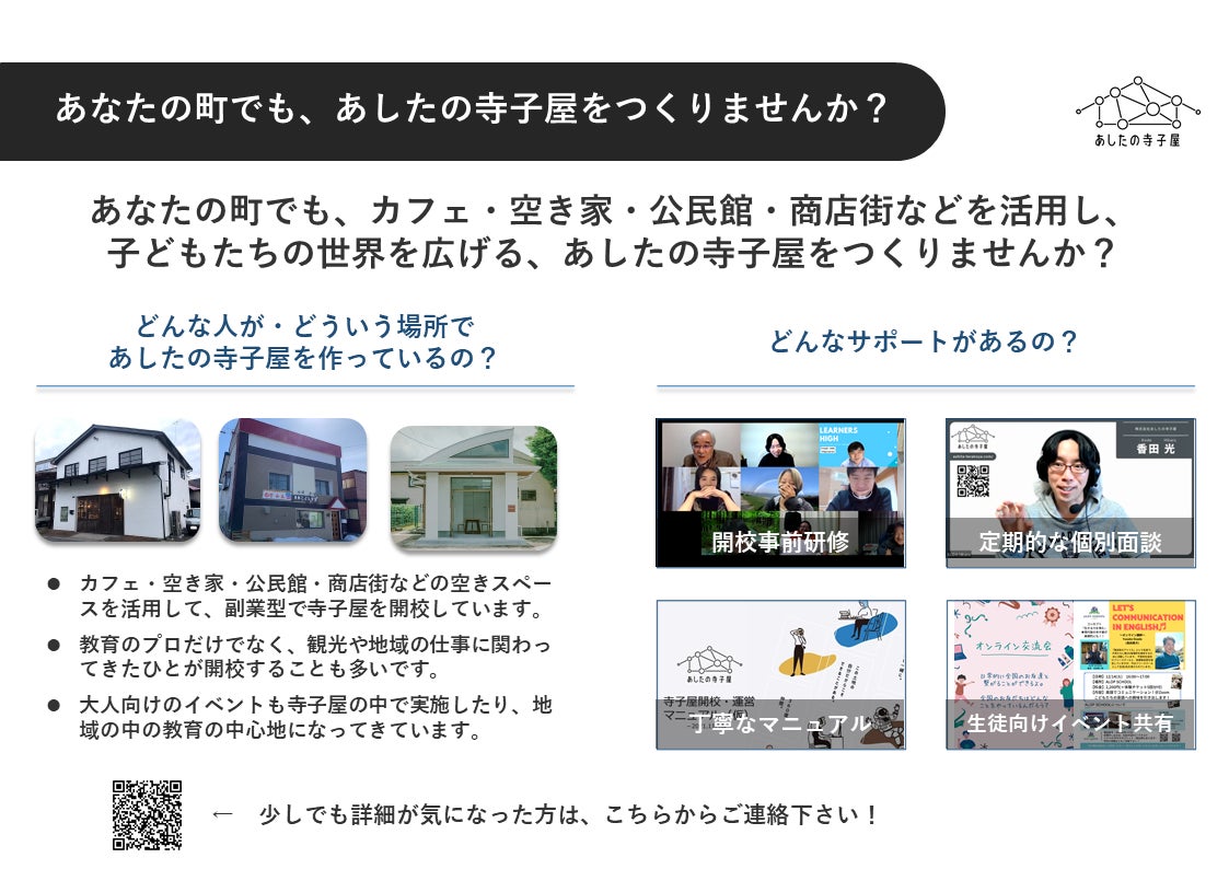 なお、当社では寺子屋を立ち上げるうえでのマニュアルの提供や・各種の個別サポートも手厚く行っております。こうした当社からのサポートに加え、全国に点在する、あしたの寺子屋を同時に開校する"同期"のコミュニティも、寺子屋づくりの強い味方になっているとの声を、寺子屋開校者の皆さんから頂いております。