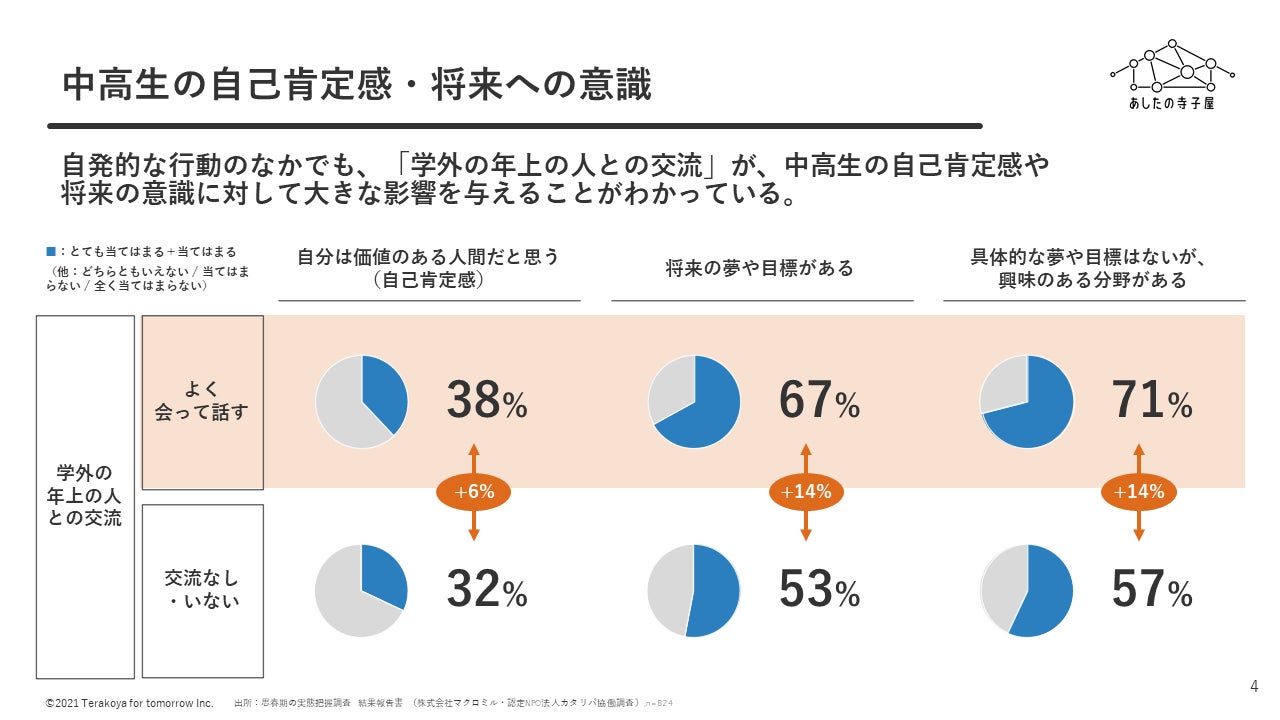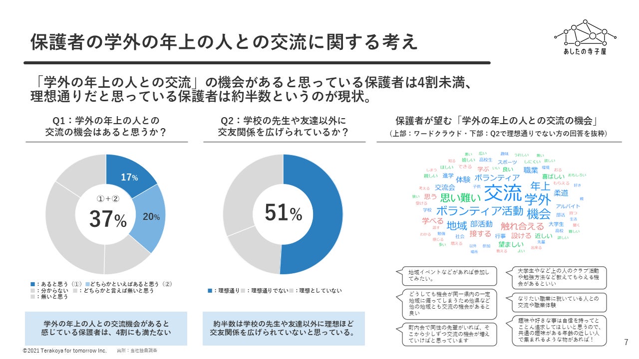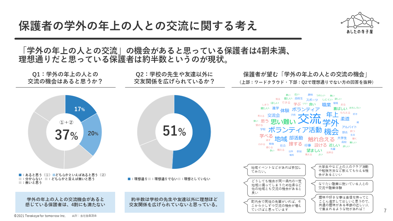 学校も冬休みに入り、家庭では、子どもの人生を豊かにする様々な体験づくりや、家庭以外での子どもの居場所・交流関係づくりに対する関心が高まっている時期となっています。そのような背景下、全国の地域に生きた学びの居場所をつくる株式会社あしたの寺子屋は、「学外の年上の人との交流ができる子どもの居場所」の価値やニーズに関して、過去に外部機関が実施したレポートのまとめに加え、独自のアンケート調査を実施しました。