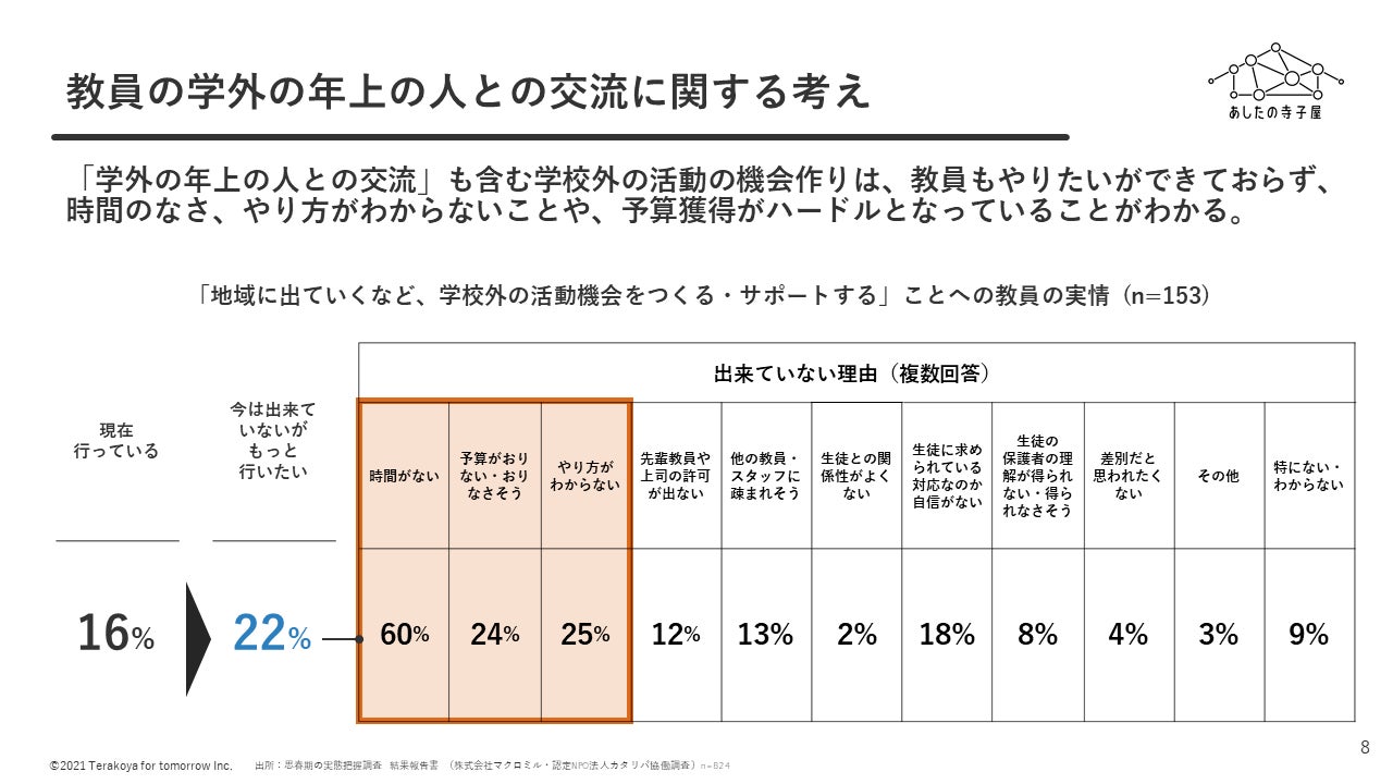 ■そして、上記のような「学外の年上の人との交流」の機会があると思っている保護者は4割未満、理想通りだと思っている保護者は約半数というのが現状です。教員も生徒が地域に出ていく「学外の年上の人との交流」も含む学校外の活動の機会作りは、やりたいができておらず、時間のなさ、やり方がわからないことや、予算獲得がハードルとなっていることがわかります。