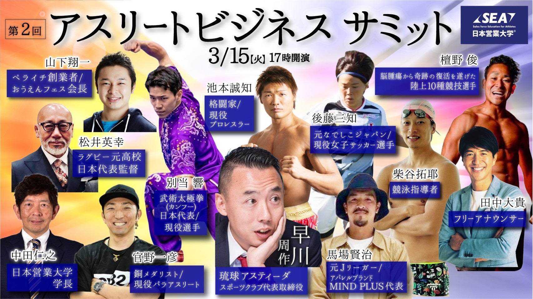 アスリートに特化したビジネス教育機関「日本営業大学®️」を運営する一般社団法人S.E.A(本社:大阪府大阪市、代表理事:中田仁之)は、アスリートとビジネスの融合をテーマに様々な社会課題について考える「第2回アスリートビジネスサミット」を2022年3月15日(火)にリアル及びオンラインによるハイブリッド方式にて開催致しました。