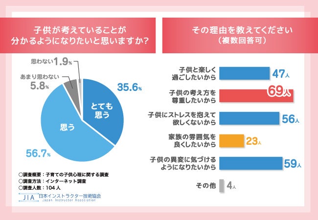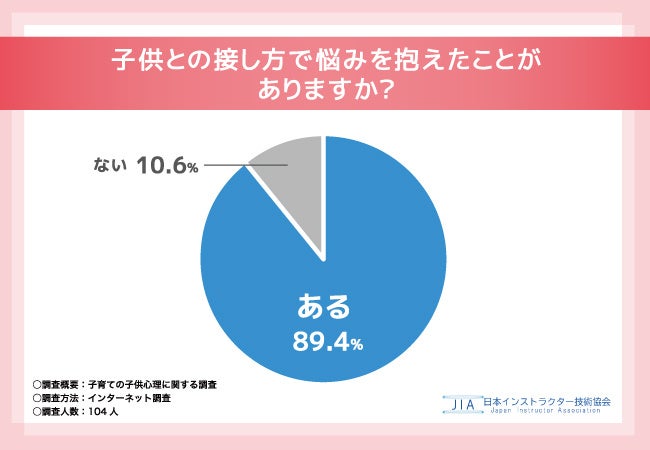 そこで今回、子供心理カウンセラーの資格検定試験(https://www.jpinstructor.org/shikaku/childshinri/)を主催する日本インストラクター技術協会(https://www.jpinstructor.org/)は、子育てをする全国の親御さん104名を対象に「子育ての子供心理」に関するアンケートを実施しました。