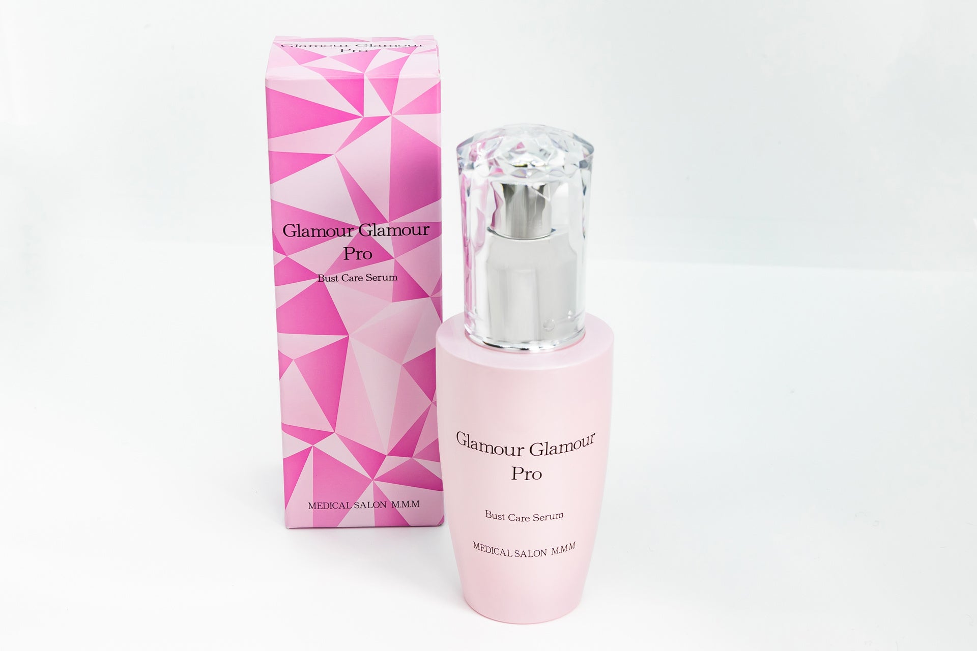 M.M.Mが研究開発したオリジナルバストケア美容液「GlamourGlamour・Pro 」はこれまで多くのお客様から「ホームケア用に美容液を作って欲しい」という声があったことから誕生いたしました。業界注目の美乳作りに欠かせない2大ボリュームサポート成分「ボルフィリン」、「アディフィリン」をダブルで配合し、「ふんわり」「ハリ・弾力」「透明感・ツヤ」 3つの美乳ポイントに働きかけるバストアップ専門サロン仕様の美容液です。デリケートなバストトップにも塗布できるよう、お肌に優しい低刺激処方製法なので安心してご使用いただけます。さらに、“4ヶ月経過しても腐らない奇跡のリンゴ”と呼ばれる品種のリンゴから抽出された植物幹細胞を培養したエキスと、“美肌スイッチ”とも称されるEGF作用*が期待される新時代のエイジングサポート成分なども配合したことでツヤのある理想のデコルテへと導きます。