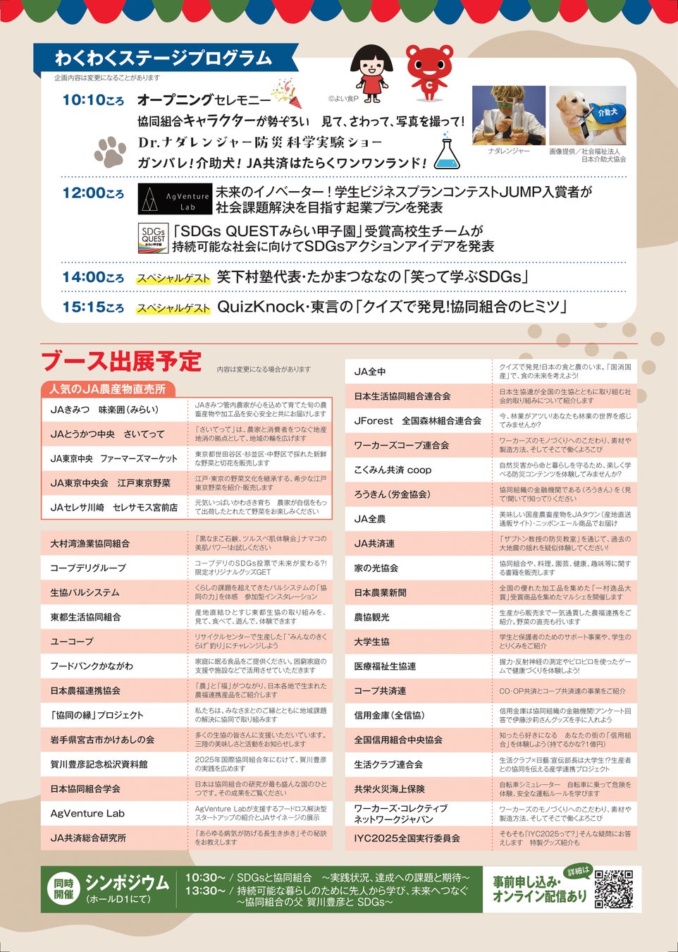 来場者の皆さんに協同組合の特徴を楽しく理解・実感していただけるよう、様々な協同組合による多彩なブース出展とスペシャルゲストを迎えてのステージ企画を予定しています。