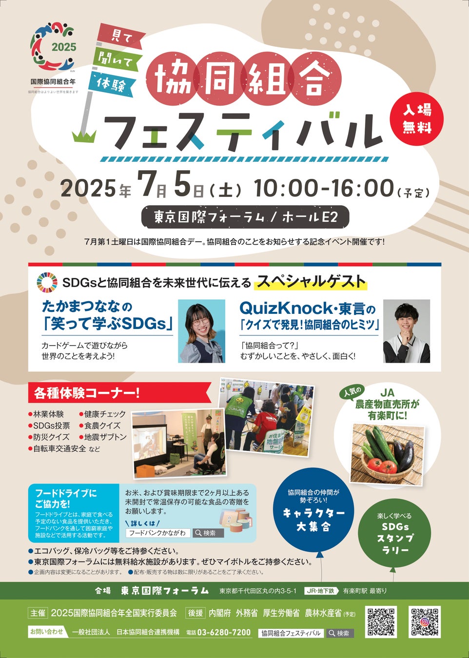 2025年は国連が定めた国際協同組合年、7月第1土曜日は国際協同組合デーです。これらを記念して2025国際協同組合年全国実行委員会(代表・JCA会長 山野 徹)は、7月5日(土)に東京・有楽町の東京国際フォーラムで「見て、聞いて、体験 協同組合フェスティバル」を開催します。