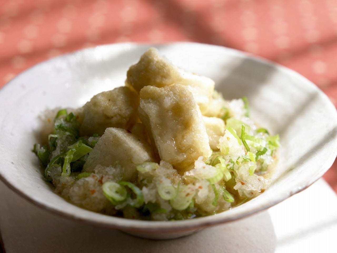 ⑤④に③の豆腐を入れまわりが固くなるまで触らずに揚げる。まわりから揚げ油をかけながらこんがりときつね色に揚げ、油をきる。