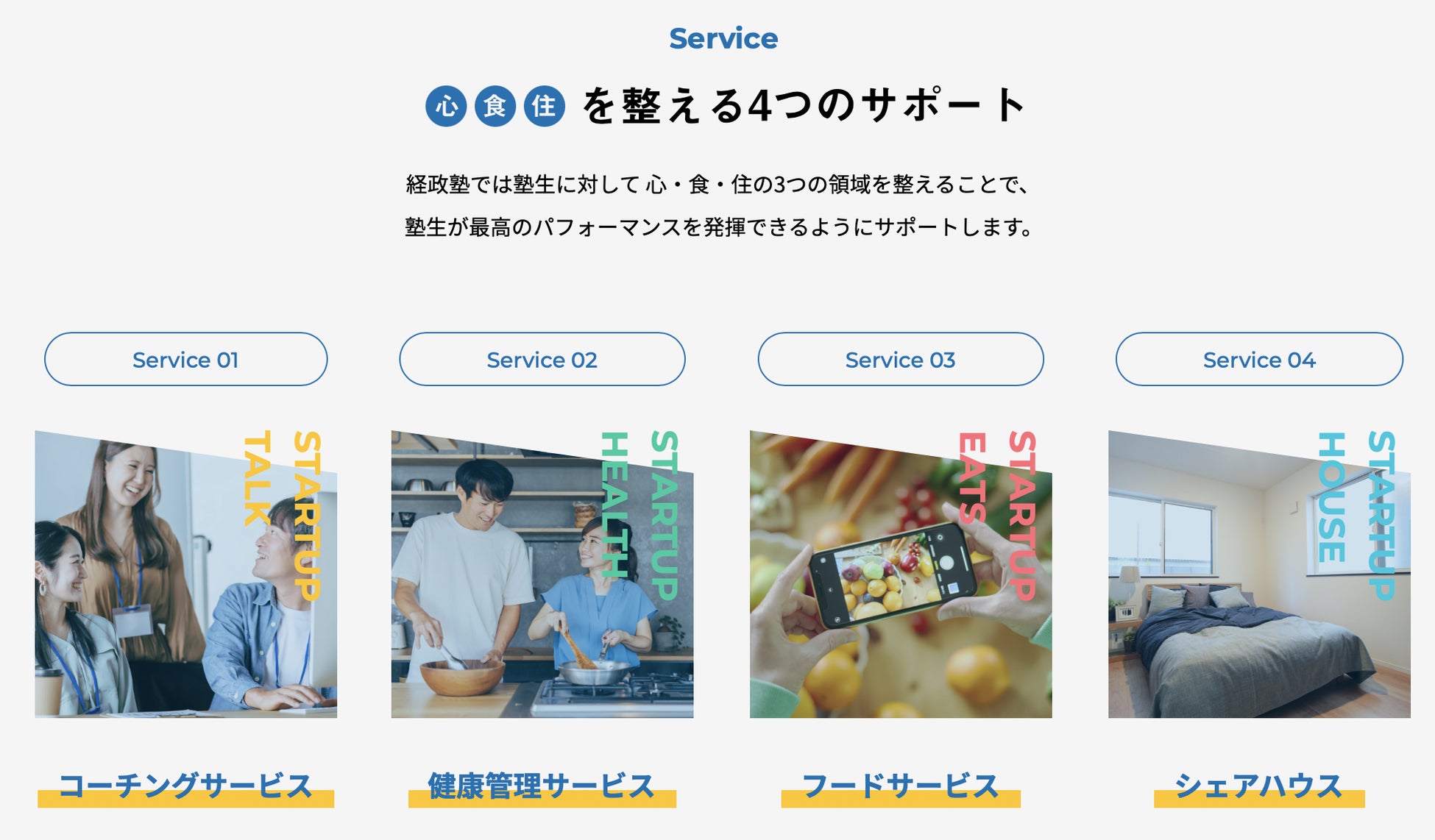 REALIZE DREAMS TOGETHER〜夢を実現する塾生と共に走る〜を掲げ、起業を志す意識の高い学生を、心・食・住の3つの領域とこれらを整える4つサポートで、塾生が最大のパフォーマンスを発揮できる環境を提供するサービスです。
