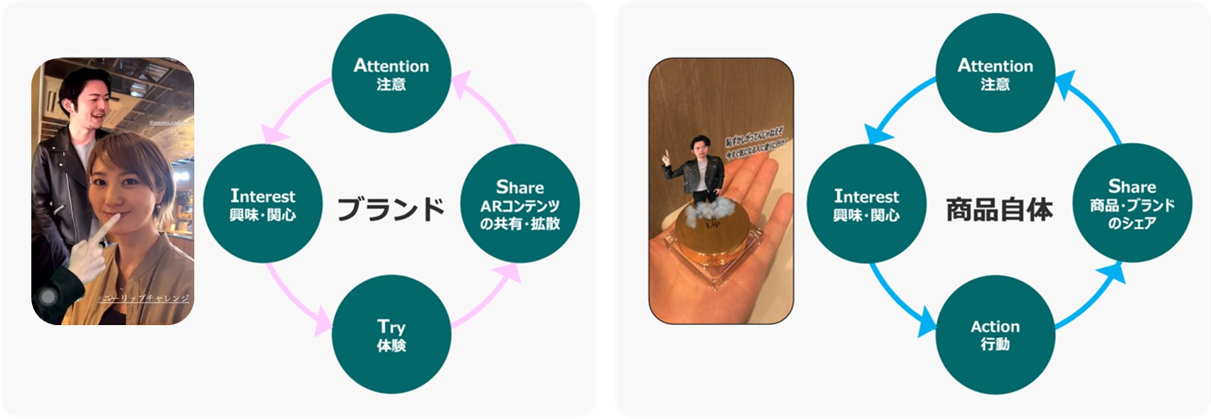 『NiiLip』の事例のようにマーケティング施策にARを活用する事で、下図のように2パターンのUGCに至るまでの行動サイクルが生まれます。