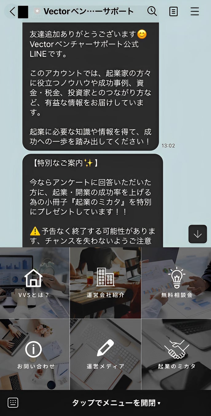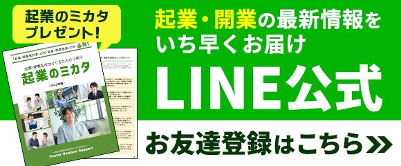 LINE公式『Vectorベンチャーサポート』では、起業や開業に関するノウハウ、補助金・助成金や資金調達、会社設立についてなどあらゆるジャンルの最新情報をお届けします。有益な情報をお届けし、起業家の成功率向上に貢献してまいります。