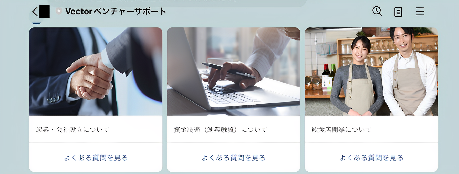 起業・開業時に不安を抱く方は非常に多いです。LINE公式『Vectorベンチャーサポート』では、会社設立、創業融資、飲食店開業などの起業・開業に関わる60以上のQ&Aをご用意しております。起業家がよく悩んでいる質問に対する回答をLINE公式『Vectorベンチャーサポート』から時間・場所を問わず、いつでも確認することが出来ます。