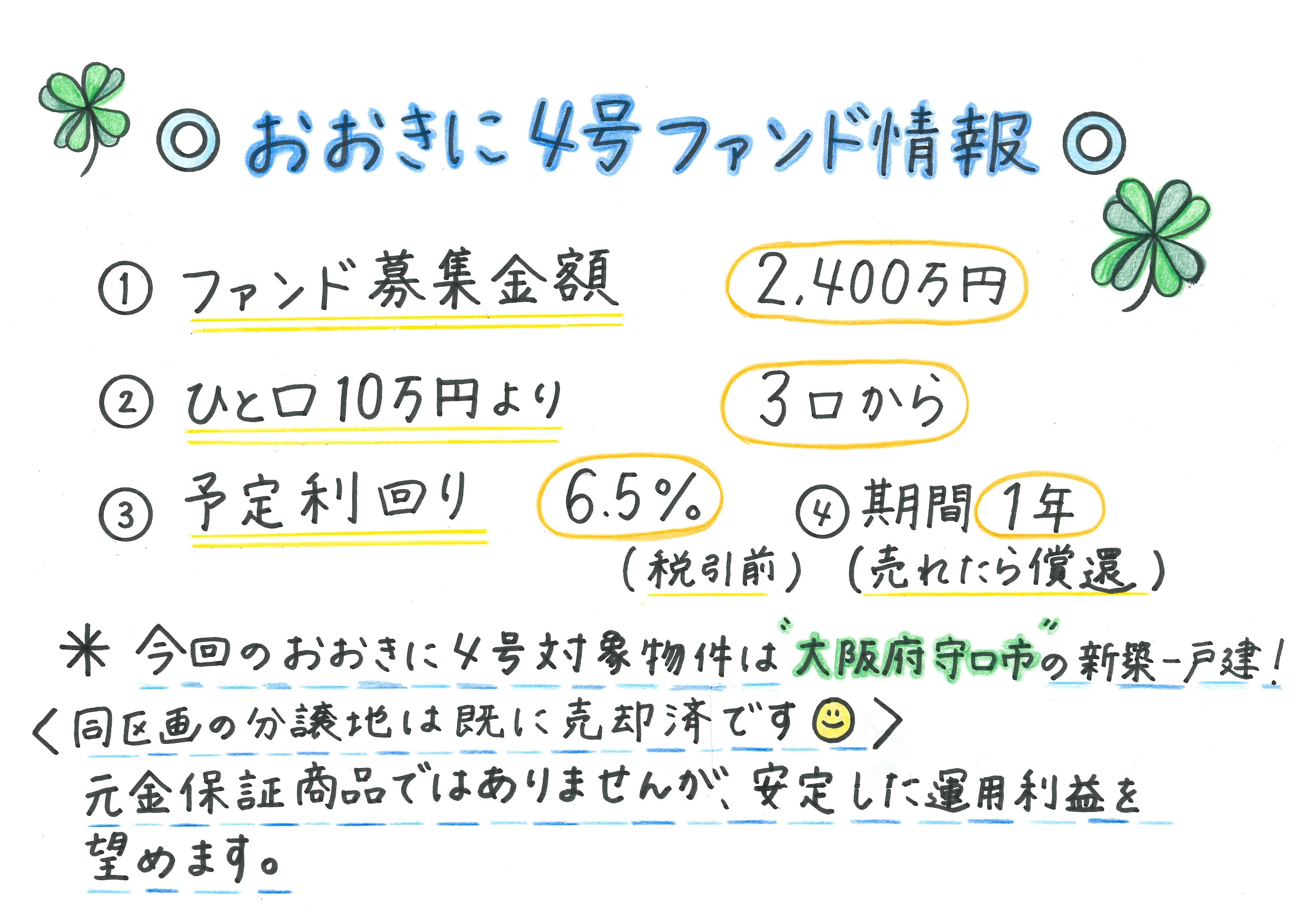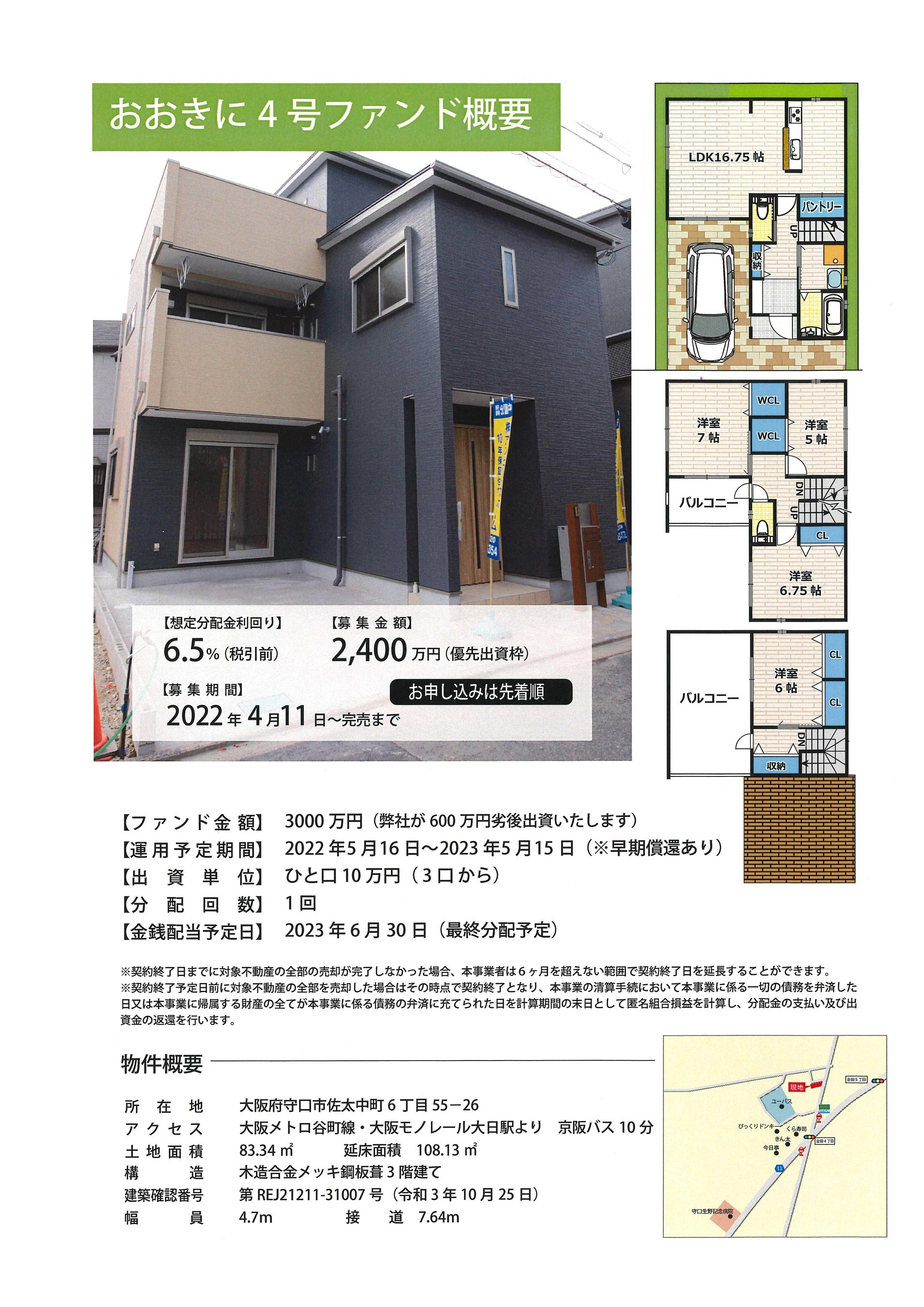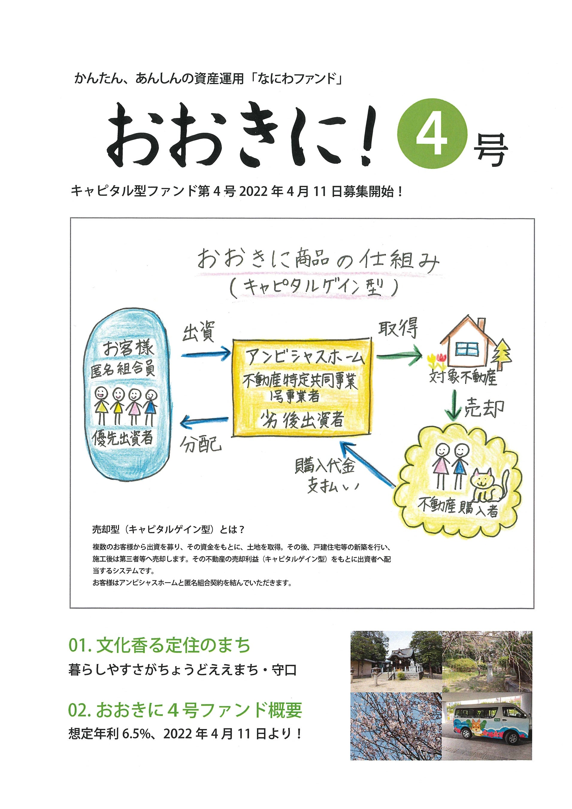 2022年3月31日HP上に情報公開し、4月1日より既存のご出資者様及び 資料請求を頂いたお客様へおおきに4号のパンフレットを発送いたしましたところ、おかげさまで募集金額をはるかに上回るお申込みを頂き、4月11日に即日完売となりましたことをお知らせいたします。