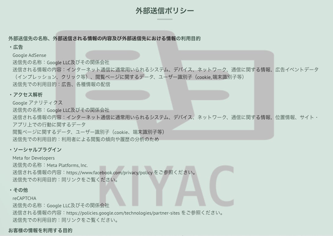 今回、KIYACでは、「利用者が容易に知り得る状態に置く(いわゆる公表)」の手段として、外部送信ポリシーを準備するためのジェネレーターをリリースいたしました。