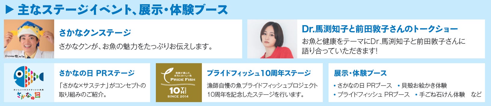 そのほか、さかなクンステージやDr.馬渕知子と前田敦子さんの栄養と健康トークショー等を実施します。また、貝殻お絵描きや鮮魚タッチ等の体験・展示ブースや被災地復興応援・地魚PRブース(JF福島漁連・JF全国漁青連他)にて漁師飯の販売等を予定しております。