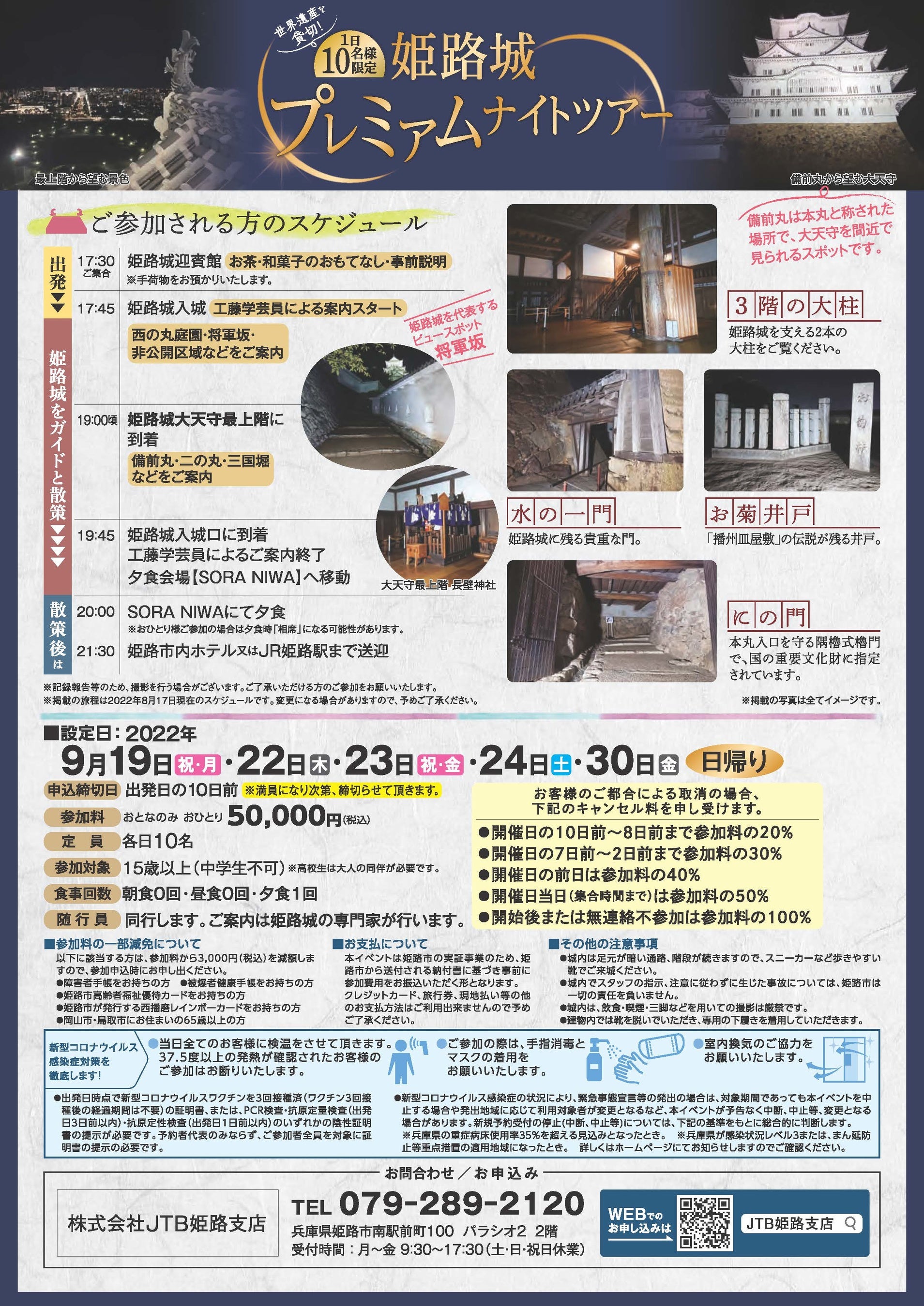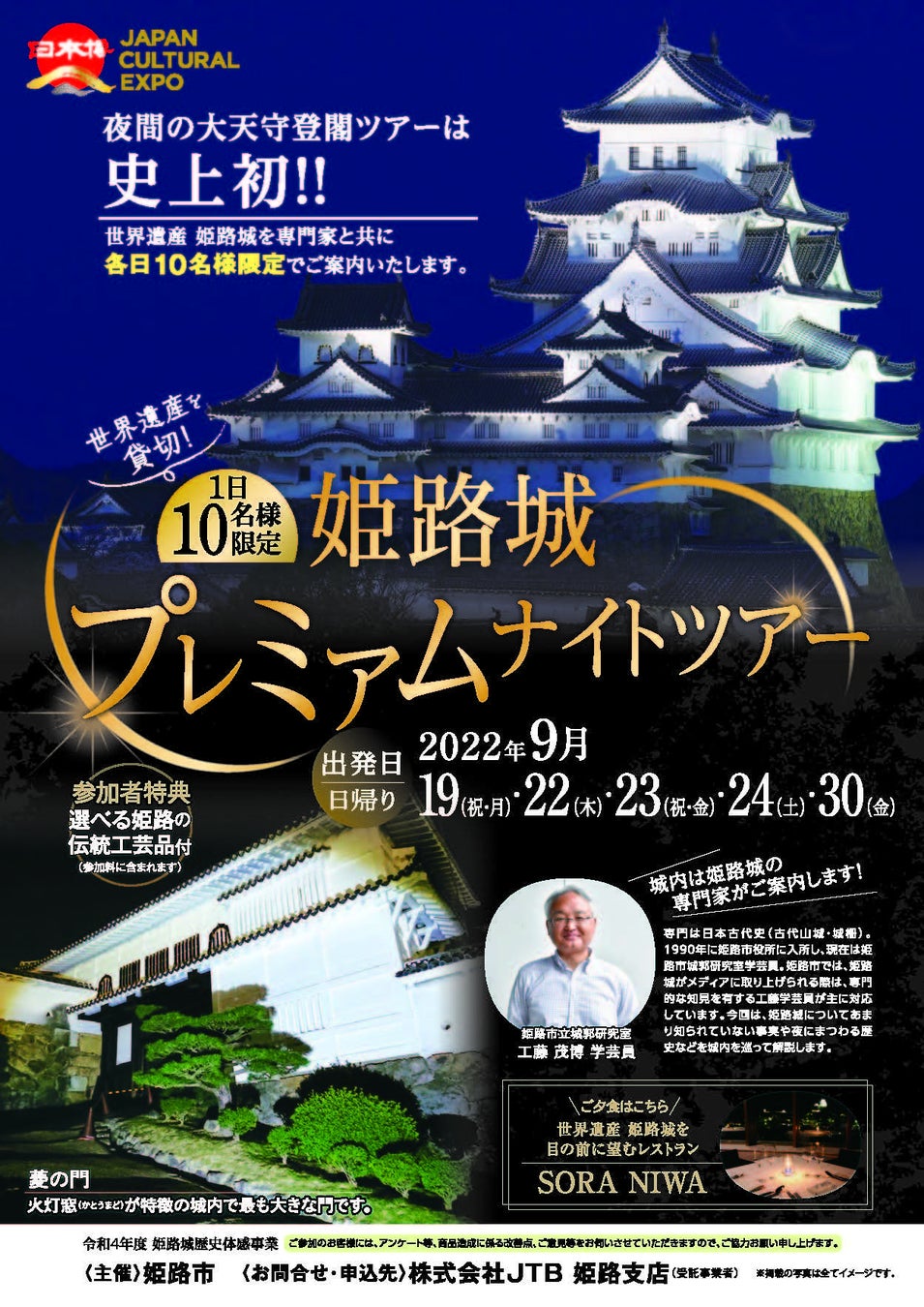 姫路市(兵庫県姫路市安田四丁目1番地)は、令和4年9月に計5日間、世界遺産姫路城を専門家とともに巡る各日10名限定のプレミアムナイトツアーを実施します。
