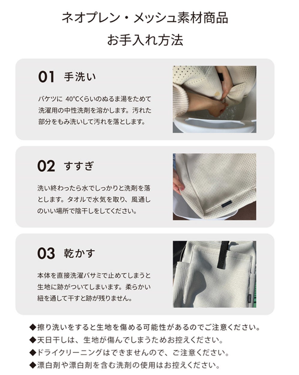 新型のウイルスが世界的に流行し、様々な新しい生活様式が生まれていく中、私たちにも何か世の中の為に役立てる事はないかと模索したところ、衣類やマスクを洗濯する事と同様にバッグも洗う事は出来ないかと考えました。そこで、水と相性のいい「ウェットスーツ」に使用する「ネオプレン生地」と、「ランニングシューズ」に使用する「メッシュ生地」を軸にEDITA(エディータ)を展開する事を決定しました。当ブランドでは、電車やバス、飲食店、職場などの外気に常に触れている日常使いのバッグを、「洗う」という新しい価値として提案しています。