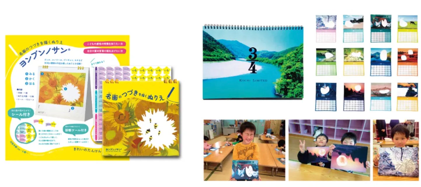 名画の一部が欠けたぬりえ『ヨンブンノサン』を中心としたアート知育玩具開発をはじめとし、企業や保育園、小学校でワークショップを多数開催しています。