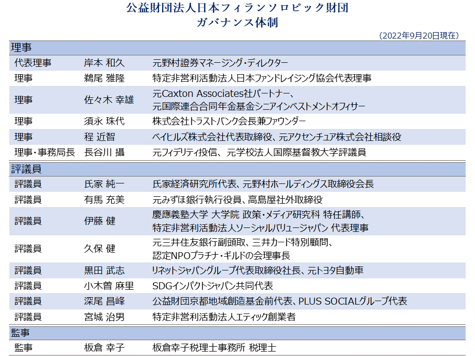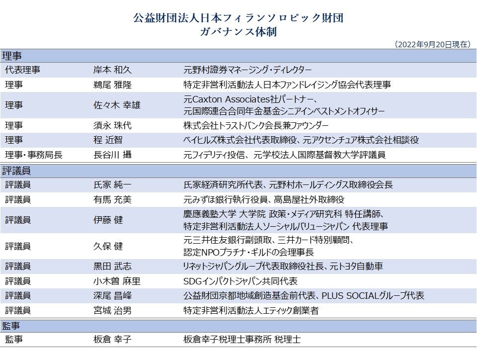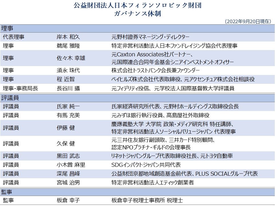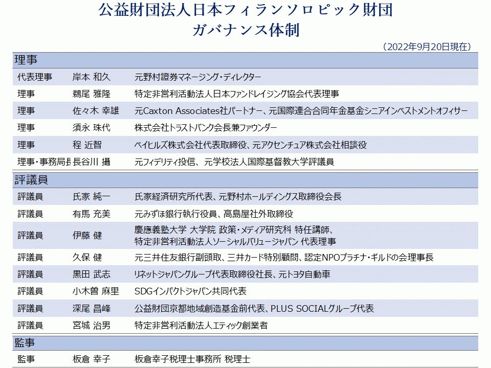 公益財団法人日本フィランソロピック財団(所在地:東京都千代田区、代表理事:岸本 和久)は、9月20日開催の2022年度定時評議員会で新任評議員と監事を選任し、新役員体制となりました。