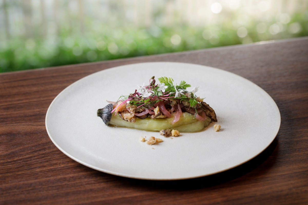 茄子と相性の良いクミンを使ったアチャールやハーブのサラダで、味の広がりと奥行きを演出。長野県の胡桃味噌田楽をイメージした味噌タプナードには、オリーブ、ケッパー、ドライトマトと和と洋を融合。ベジタリアンの方にもお楽しみいただけるよう、本来タプナードに入れるアンチョビは使わず、隠し味として味噌を採用して味わい深く仕上げました。クミン、玉葱などの身体を温める食材なども使用し、この一皿で1食に必要な野菜を十分、摂ることができます。