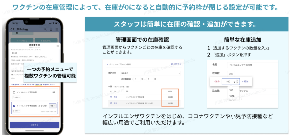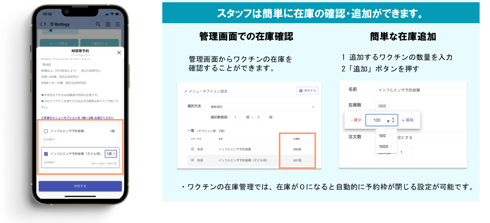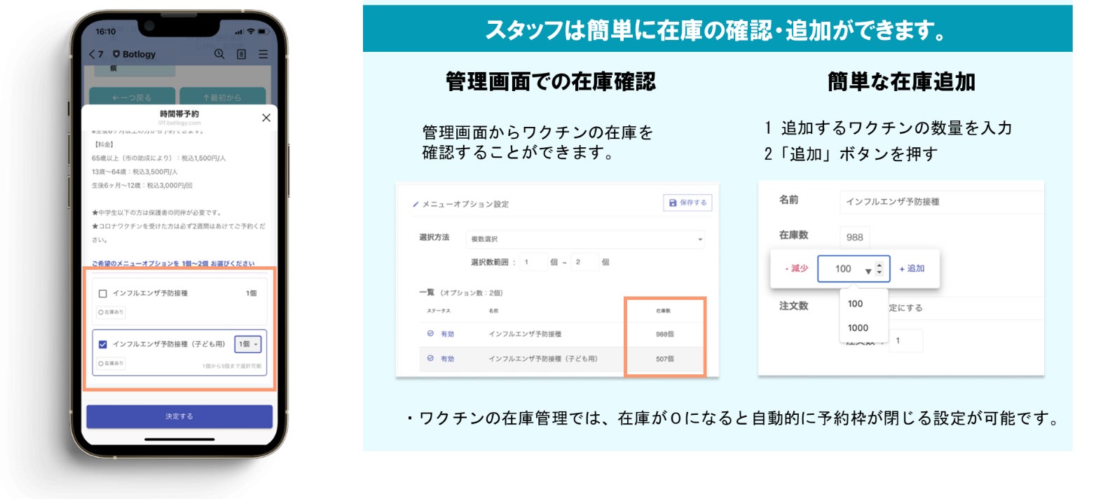 ③予約⼈数に応じてワクチン在庫数が⾃動で管理画⾯に反映されるため、⽇々の在庫確認不要