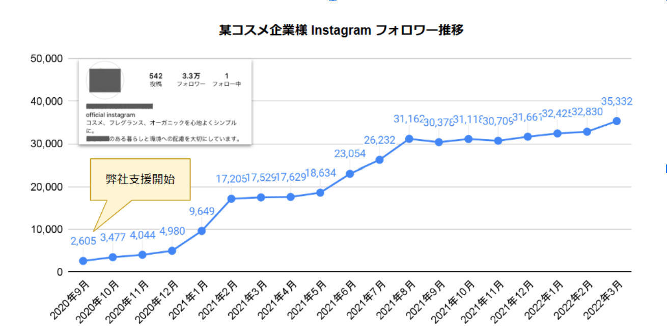 あるDtoC企業サポートにおいては、月間約1,500人の新規フォロワーの獲得、ある化粧品会社のSNSマーケティングでは、計3万人のフォロワーの獲得に成功しました。確実な成果を出すことに自信があり、フォロワー数UP保証として、フォロワー数を獲得できなかった場合には、月額費用の全額を返金するという体制を敷いています。