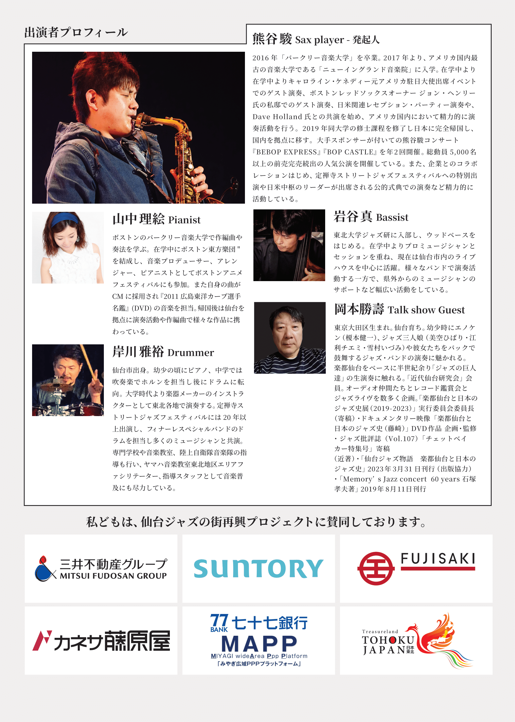 発起人の熊谷の思いと、ジャズを通した地域活性化に深く賛同をするのが下記の企業だ。