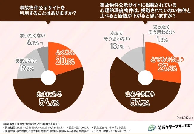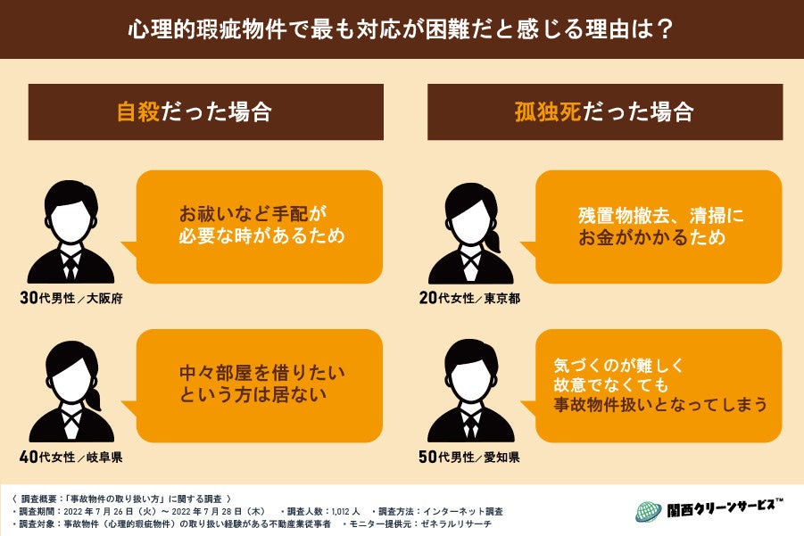 『関西クリーンサービス (所在地:大阪府大阪市)』を運営するA-LIFE株式会社(代表取締役:亀澤 範行)は、事故物件(心理的瑕疵物件)の取り扱い経験がある不動産業従事者を対象に「事故物件の取り扱い方に関する調査」を実施しました。