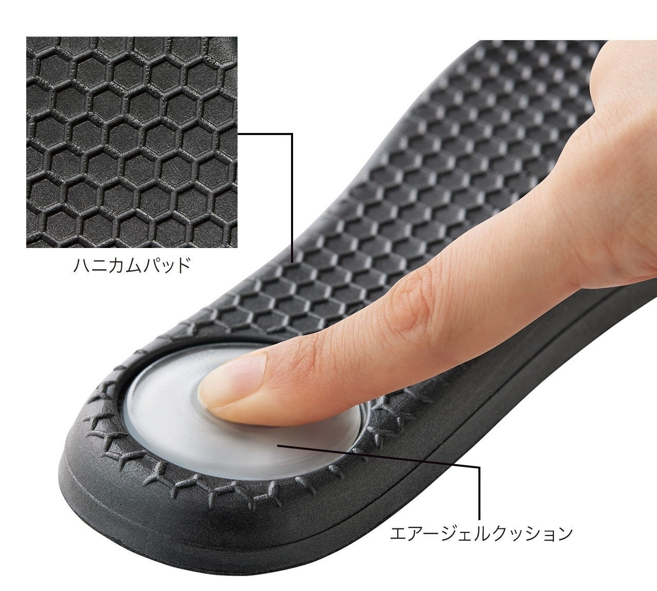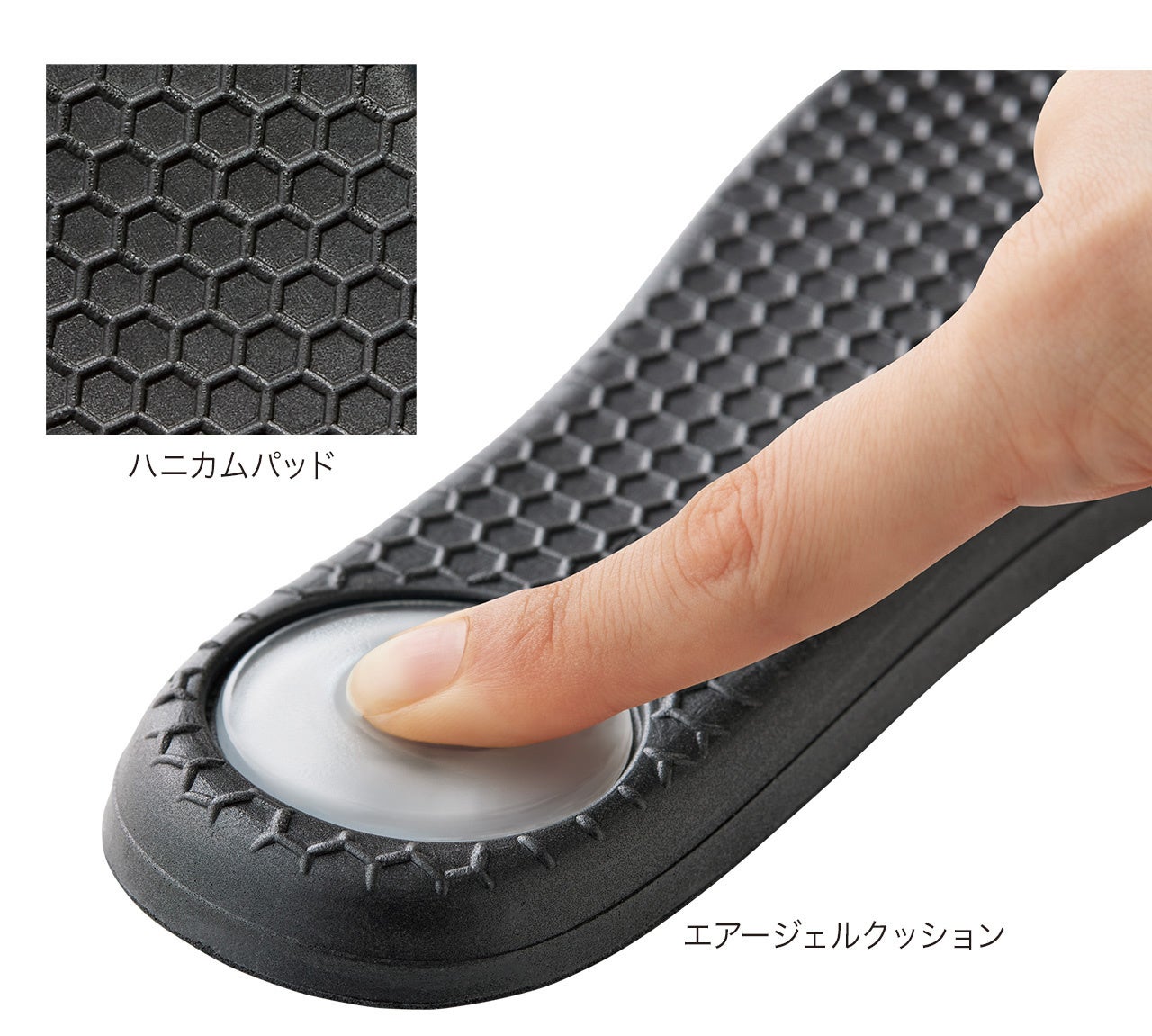 エアージェルクッションとハニカムパッドにより、足裏全体の衝撃を吸収します。
