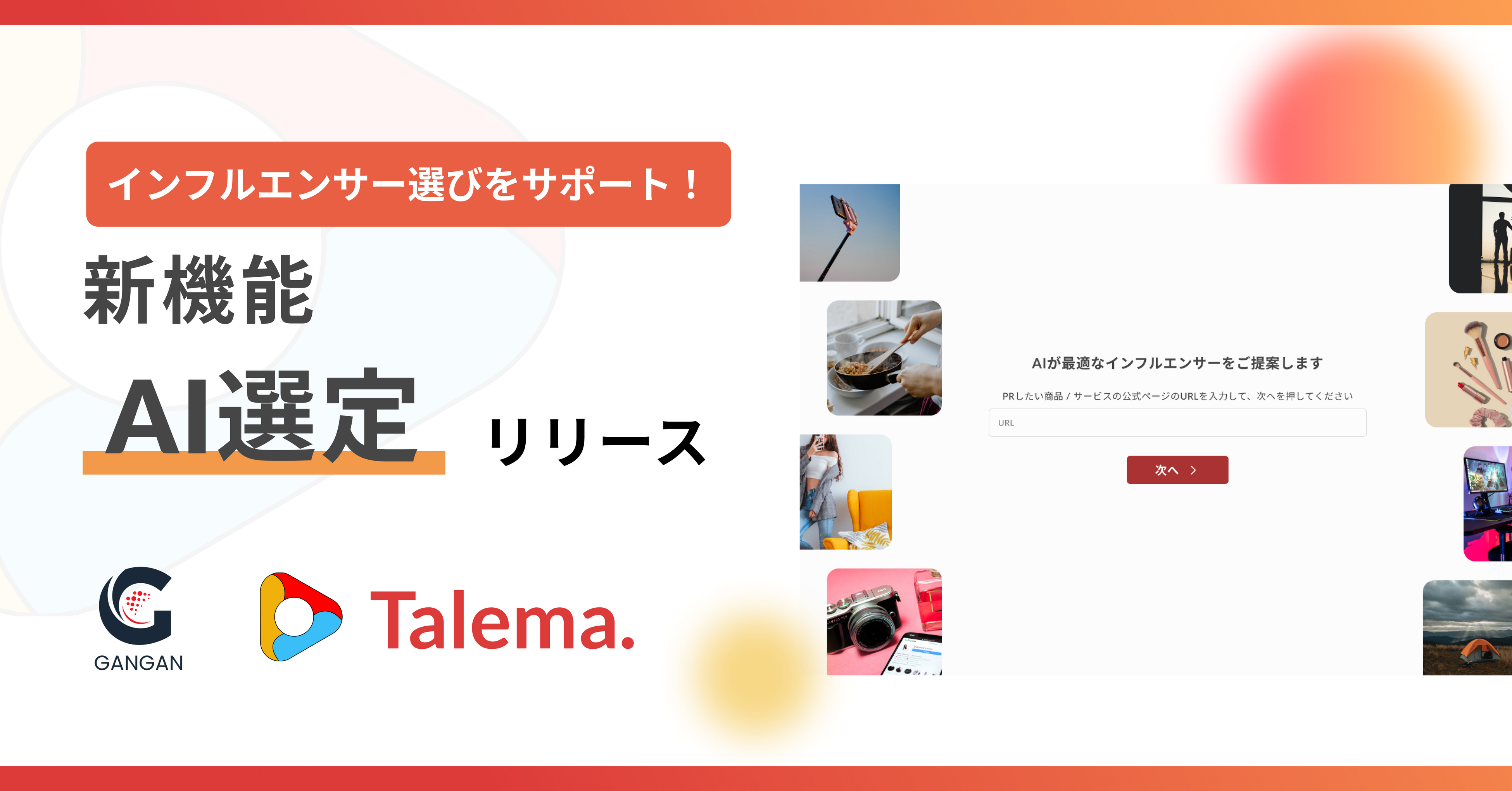 GANGAN株式会社(以下、当社)は、企業とYouTuberを結びつけ、効率的なコラボレーションを促進するマッチングプラットフォーム「Talema.」に、「AI選定」機能を導入しました。このAIはOpenAIのChatGPTを活用し、高精度なマッチングを可能にします。
