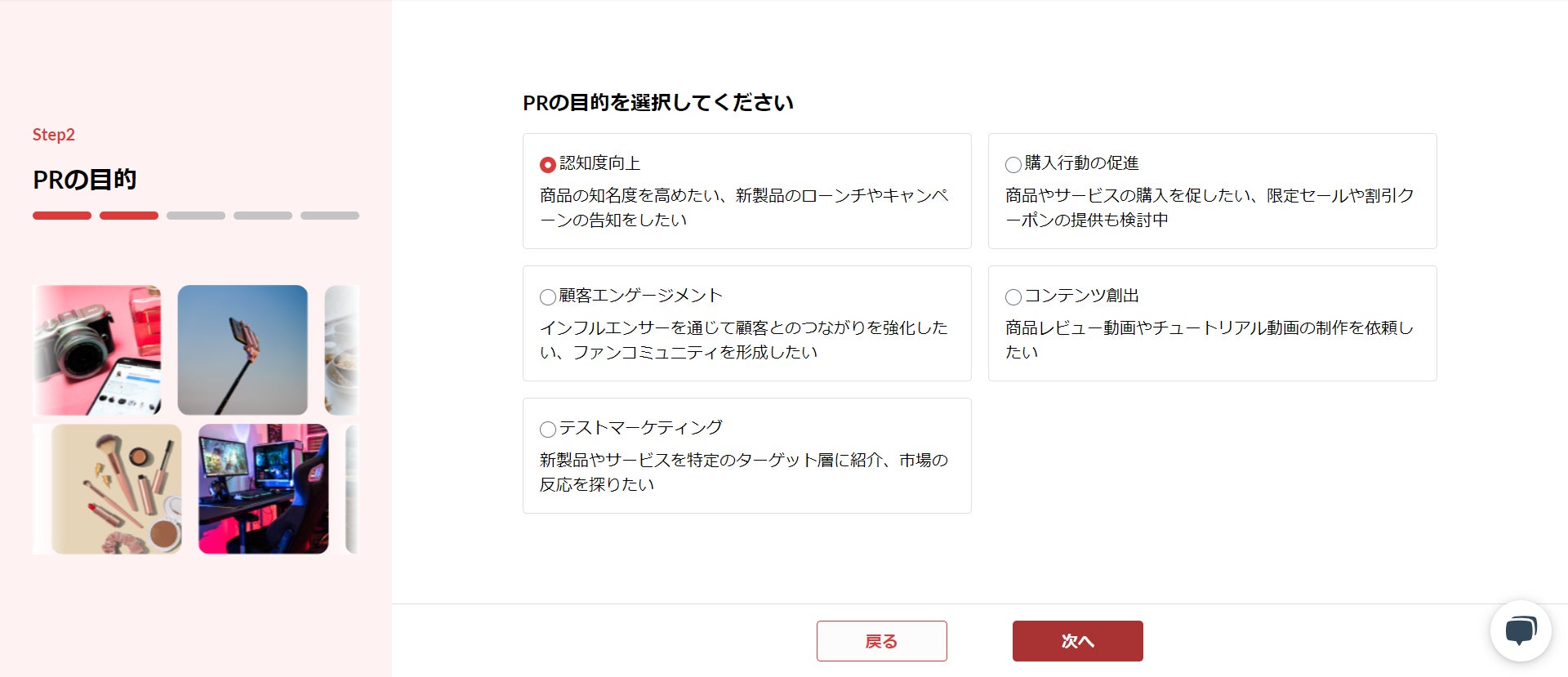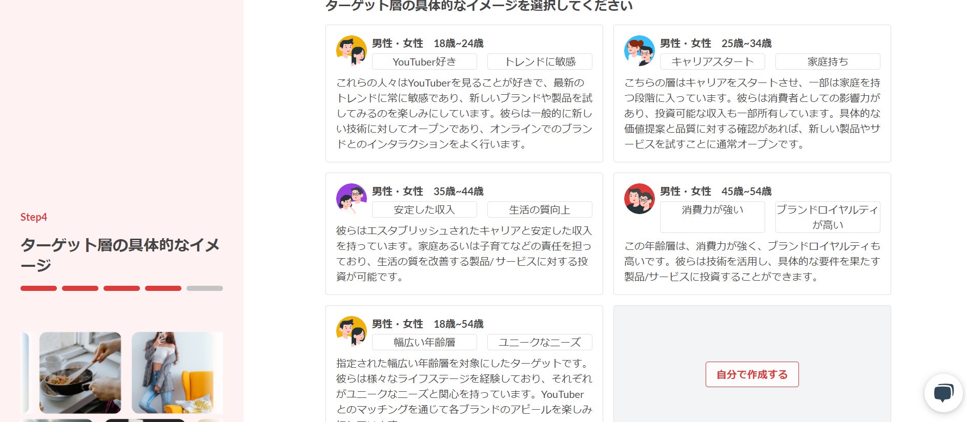 「AI選定」機能では、企業が自身の商品やサービスのURLを入力し、プロモーションの目的、予算、ターゲット層といった設問に回答するだけで、AIが最適なインフルエンサーをレコメンドします。AIは企業のニーズとインフルエンサーの特性を理解し、適切なマッチングを提供します。