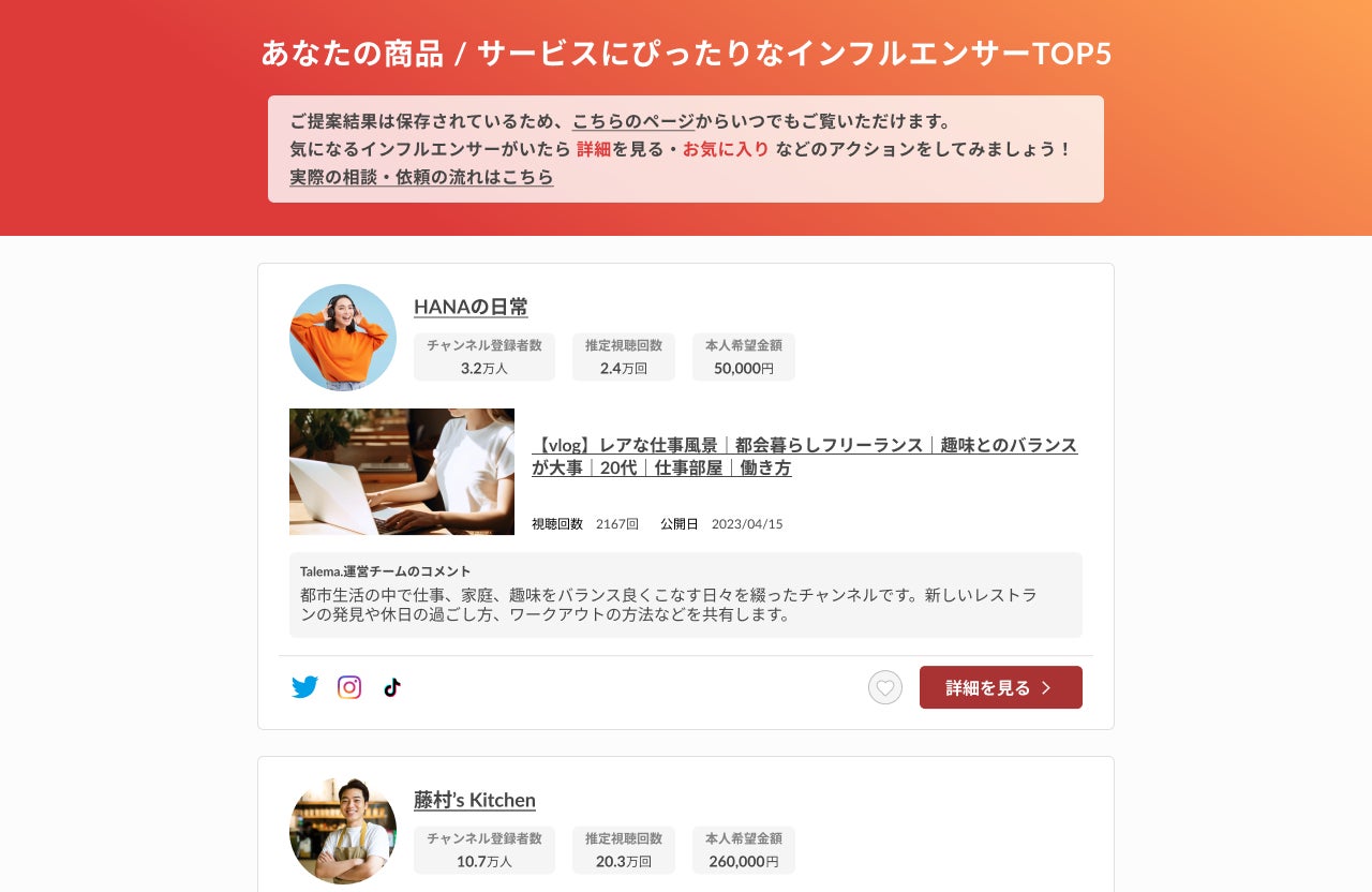 当社のAI技術は、これまでTalema.が累積した1,000件以上のマッチングデータを活用します。そのため、AIは予算に見合ったインフルエンサーを的確に選定する能力を持っています。この無料の機能により、交渉工数の削減と効率化が可能となり、企業にとって大きなメリットを提供します。