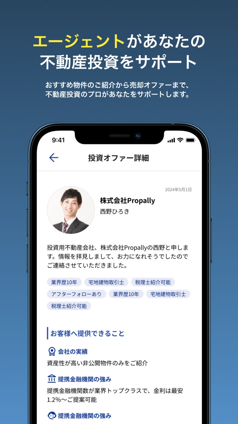 これはPropally独自のユニーク機能で、不動産投資会社や不動産投資の営業マンの透明性が低いため、自分に合ったパートナーを見つけるのが難しいという問題を解決。エージェントからしても広告費や仲介会社へのマージンよりも安くユーザーと会えるため、その分ユーザーに還元可能となり、良い物件を「安く」購入し、売却時には「高く」売却できる可能性が高まります。