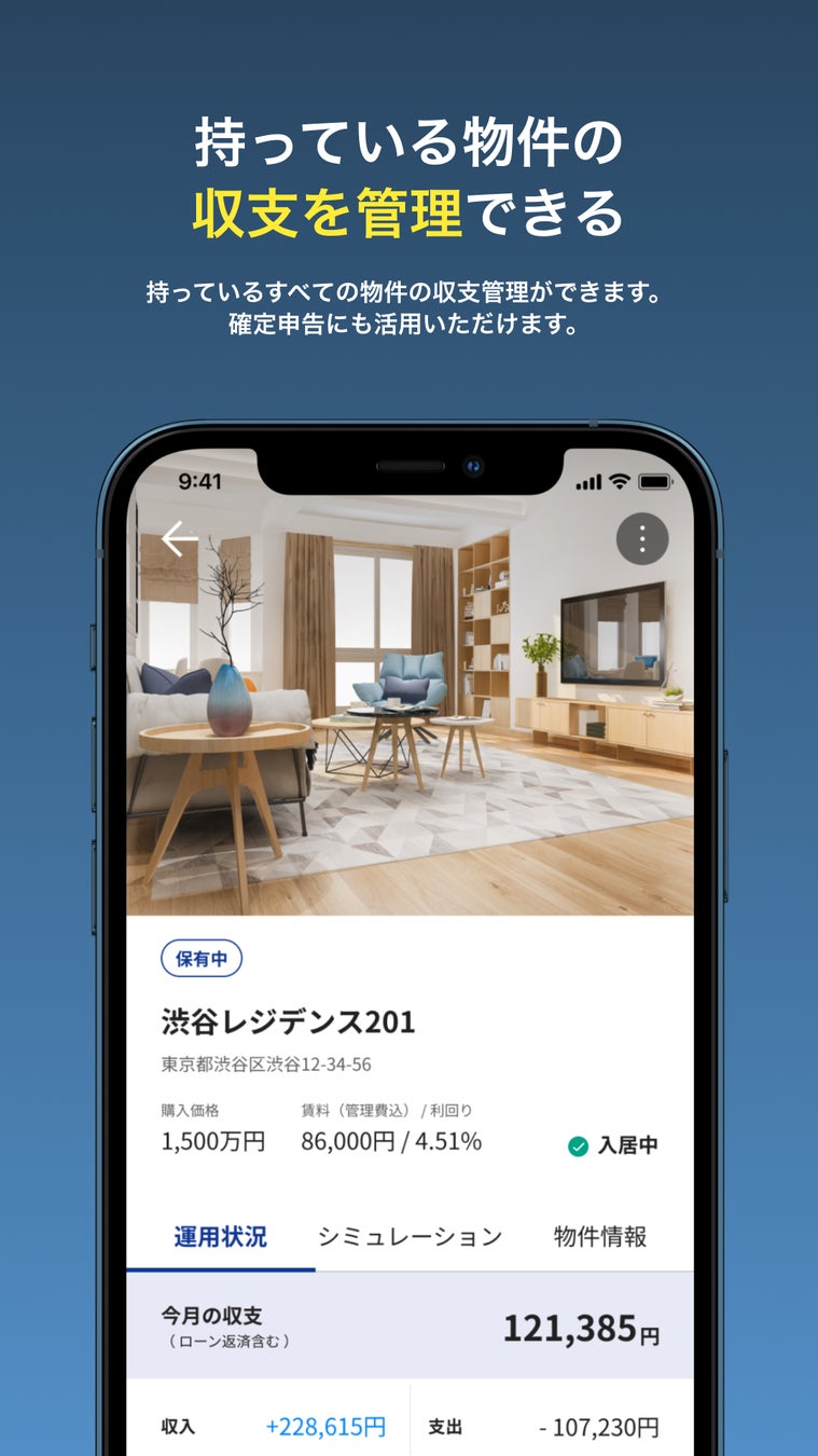不動産投資を行う上で「オファー機能」「シミュレーション機能」「収支管理機能」の3機能がカンタンにスマホ一つで利用可能な、ユーザーの収益最大化を目的とした不動産投資アプリです。