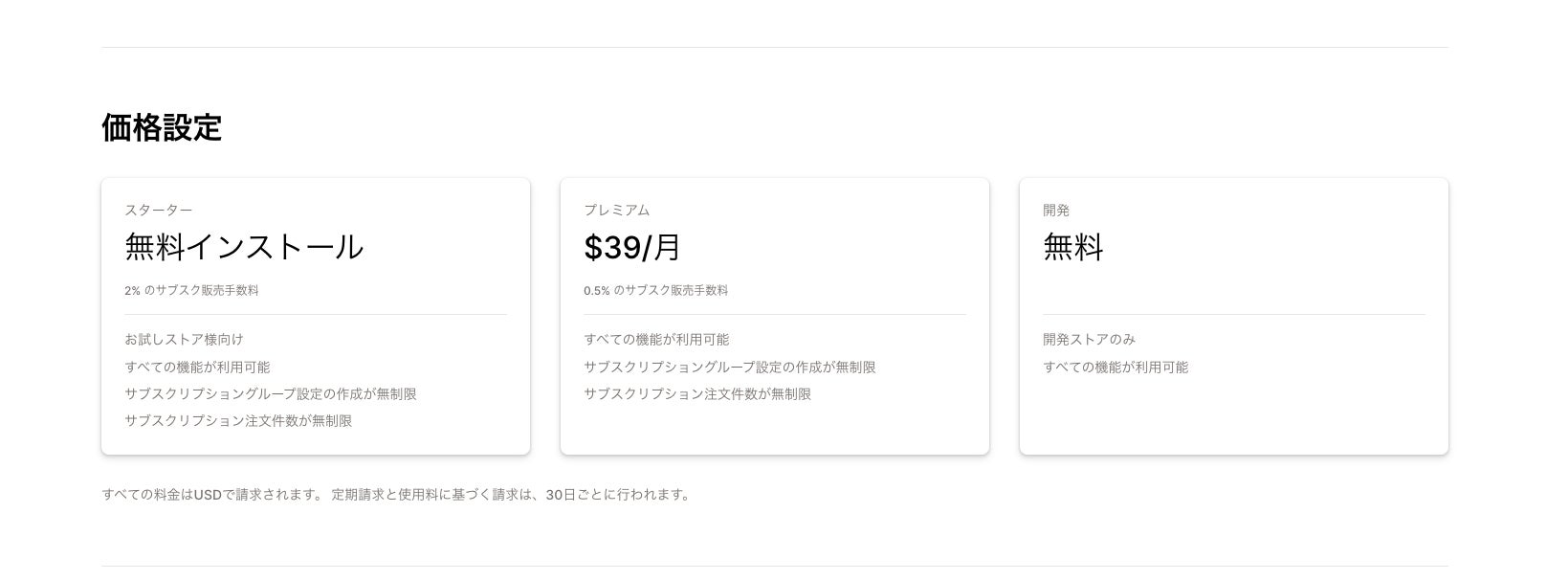 スタータープランではインストール無料、販売手数料2%、機能制限なし。プレミアムプラン$39/月、販売手数料0.5%。