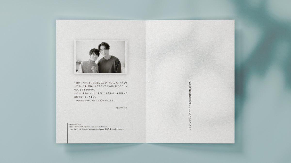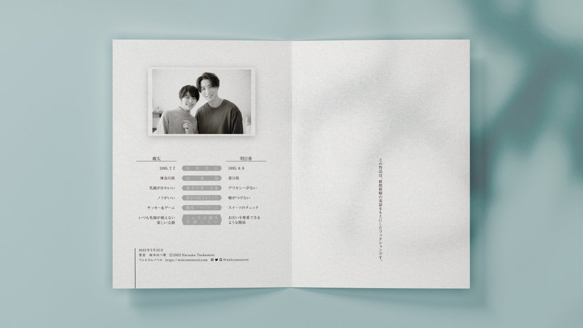 小説家・塚本はつ歌が立ち上げた、ブライダル向けの小説執筆サービスです。出会いのエピソードや思い出など、お二人にとって大切なワンシーンを元に、プロの作家が「オーダーメイドの短編小説」を執筆します。