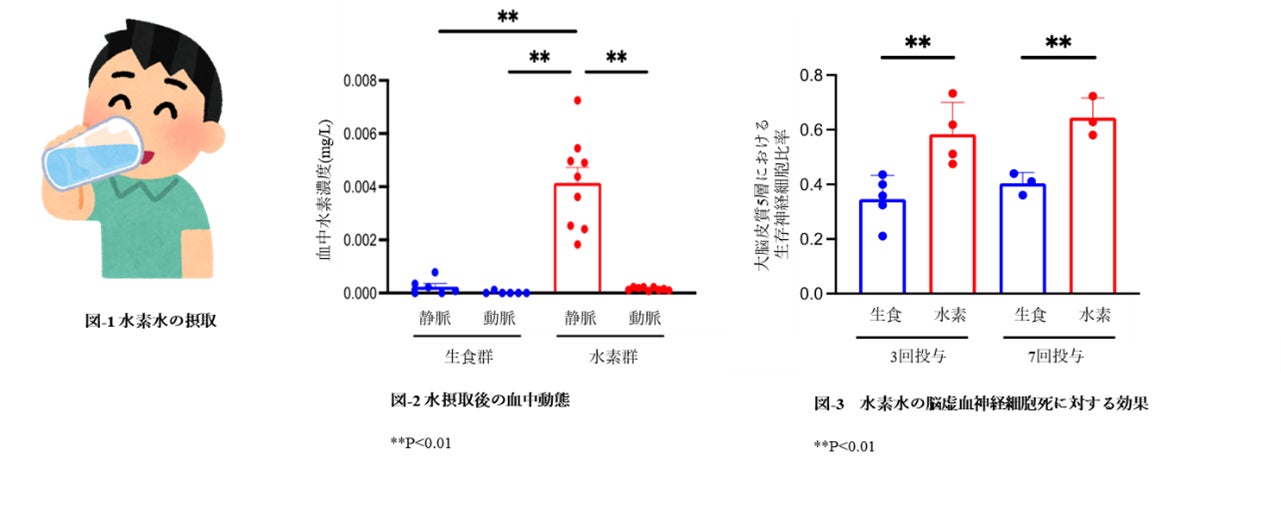 現在、水素分子の摂取には水素ガスもしくは水素水による2つの方法がありますが、水素水による水素分子の摂取には特別な機器を必要としないため、多くの研究報告があります。しかしながら、水素分子の血中動態と病態に対する有効性を同時に比較した研究は殆どなく、本研究の意義は高いといえます。今回の研究においても、水素分子が脳虚血後の神経細胞死の抑制に貢献していることは明らかですが、脳に運ばれる動脈血中の水素濃度は予想以上に低レベルであることから、水素分子による神経細胞死の抑制には未だ解明されていないメカニズムが存在する可能性があります。今後、水素分子の別の効果も検証していく予定です。