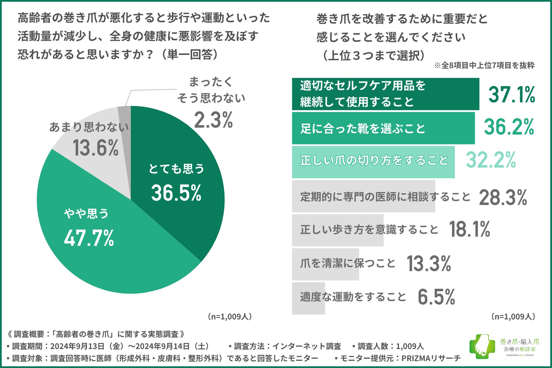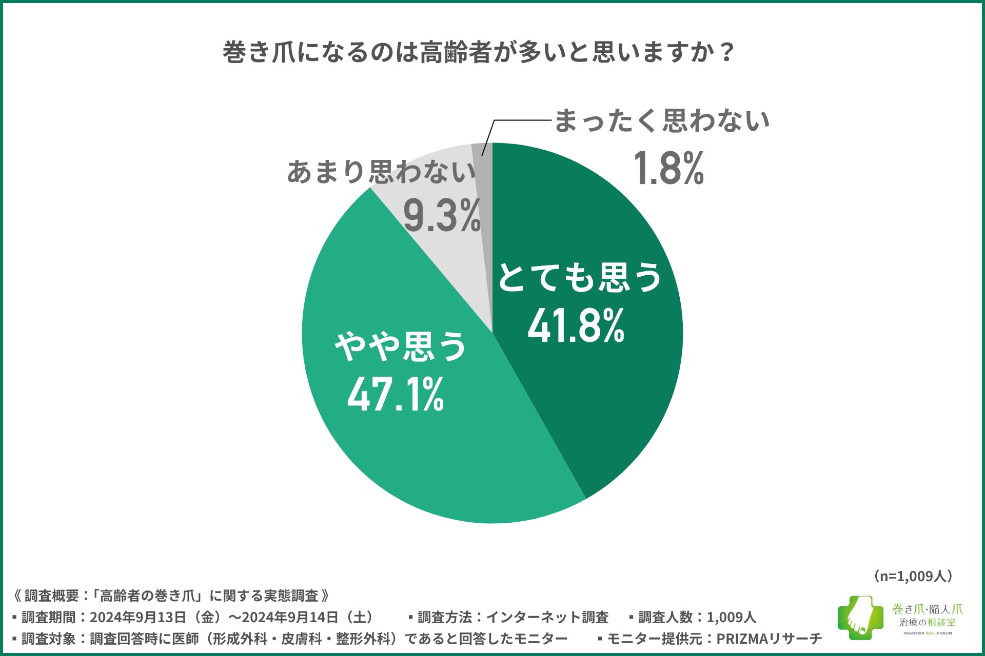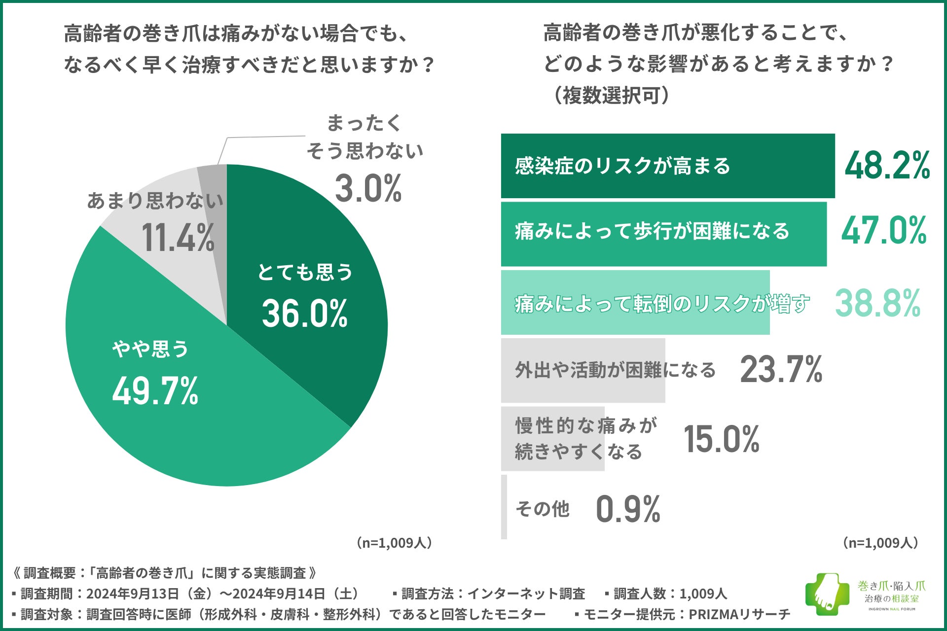 また、高齢者の巻き爪が悪化すると、身体の痛みだけでなく感染症や転倒リスクの増加、歩行困難などの身体機能にも影響を及ぼす可能性が示され、痛みがない場合でも、早期治療を行うべきだと考える医師は8割以上に上っています。