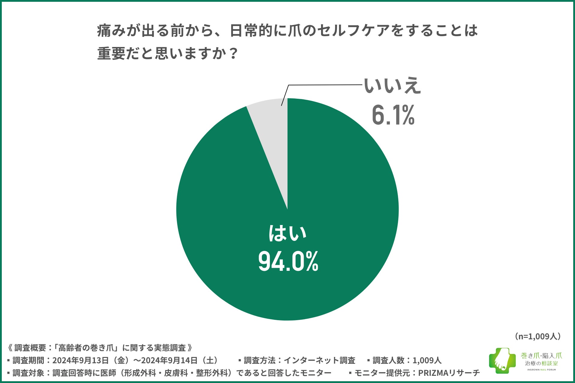 「痛みが出る前から、日常的に爪のセルフケアをすること重要だと思いますか?」と質問したところ、9割以上の方が『はい(94.0%)』と回答しました。