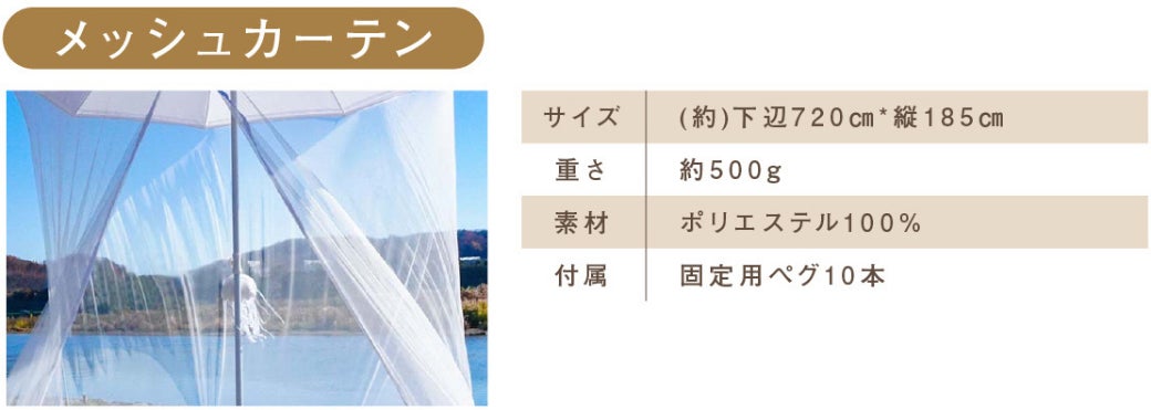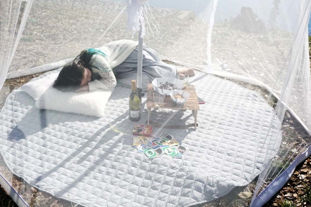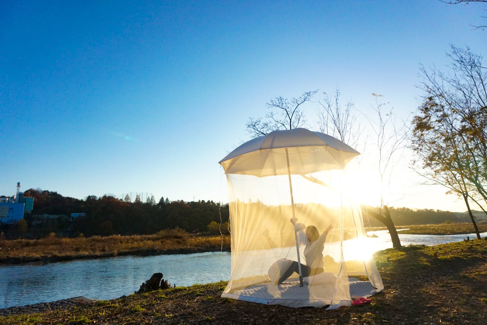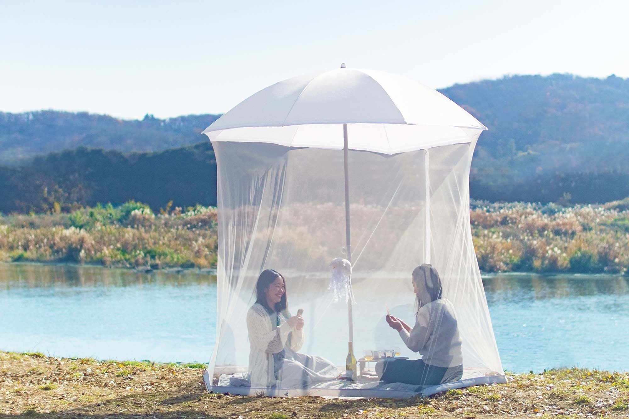 メッシュカーテンで虫をシャットアウトしながら、360°の景色を楽しめる。テントとは異なる解放感、特別なデイキャンプ、ピクニックを演出する。自宅の庭先や河原などでも。