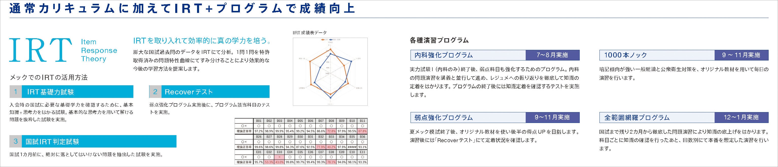 また、40年間弛みなく医師国家試験(以下、国試)合格者を輩出してきたメックのノウハウと、常に進化し続ける独自の学習システムやIRTを使った詳細な成績分析で、最新の国試傾向にも完全対応します。