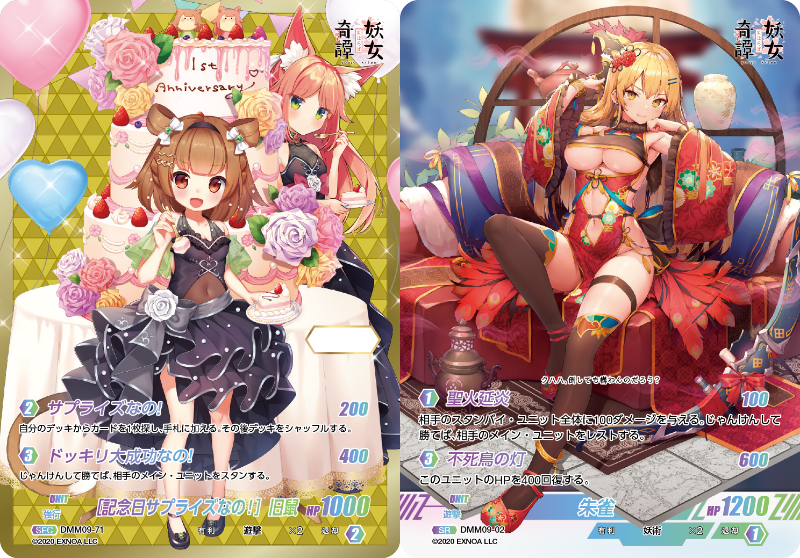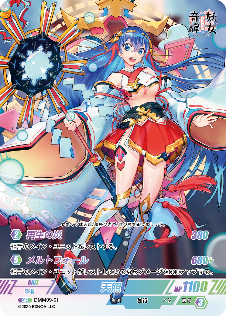妖怪任せの放置RPG『まほろば妖女奇譚』のキャラクターたちが登場する、DMM GAMES と株式会社 TCG のタッグでお送りする新作トレーディングカードゲームです。本商品は 12 ヶ月連続でリリースされるDMM GAMES トレーディングカードコレクション(注 1)の第 9 作目として発売を予定しており、同コレクション内 12 作品であれば異なる作品(注 2)とも戦うことができる戦略性、コレクション性ともに満足いただけるトレーディングカードゲームとなっております。