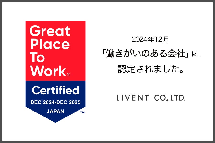 超高齢社会に生きる人々の心の豊かさと生活の質の向上をビジョンに掲げ、ライフイベントに関連する事業を展開する株式会社LIVENT (代表取締役:三上力央、本社:東京都品川区) は、Great Place to Work® Institute Japan (以下、 GPTW Japan) が実施する「働きがいのある会社」に初めて認定されました。