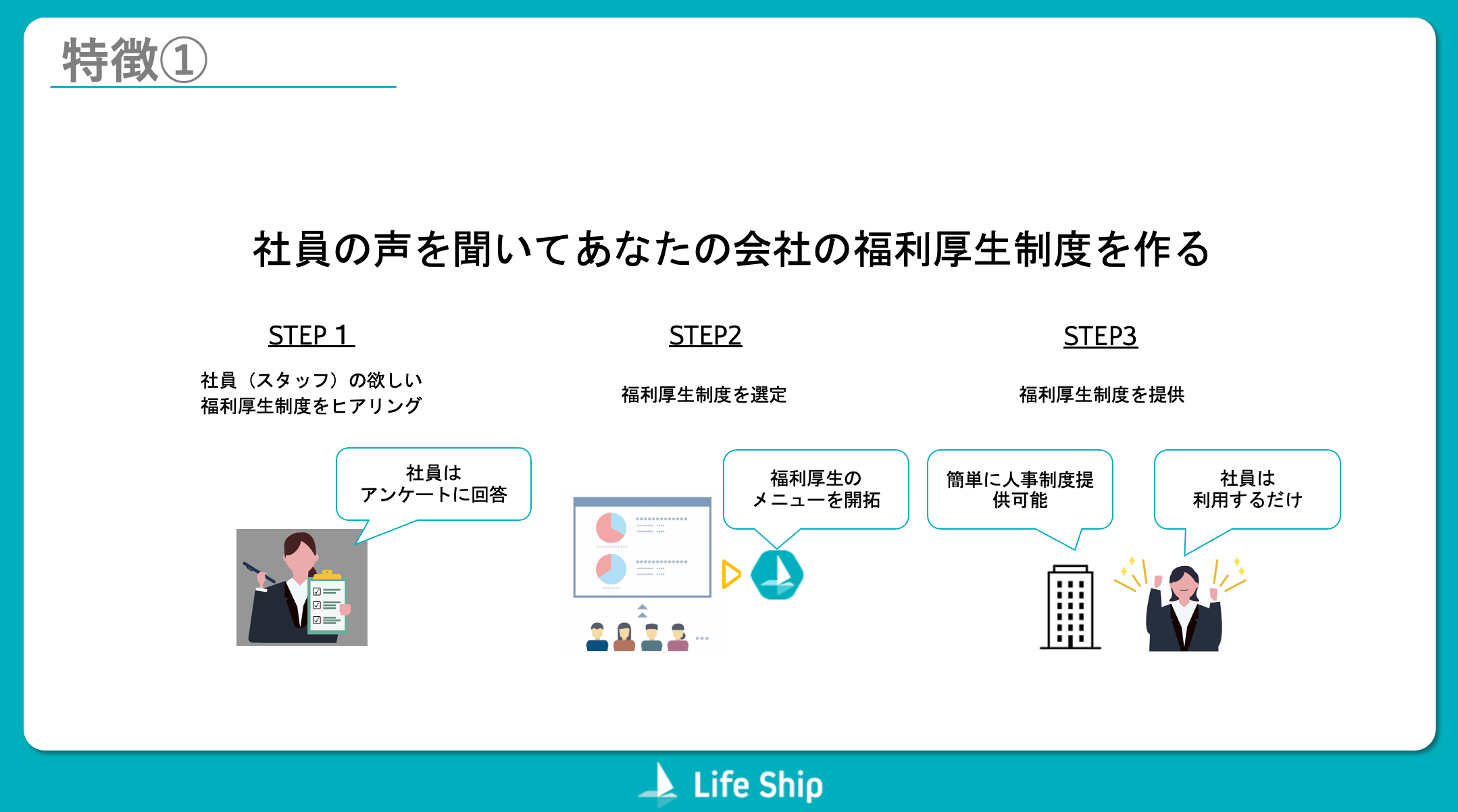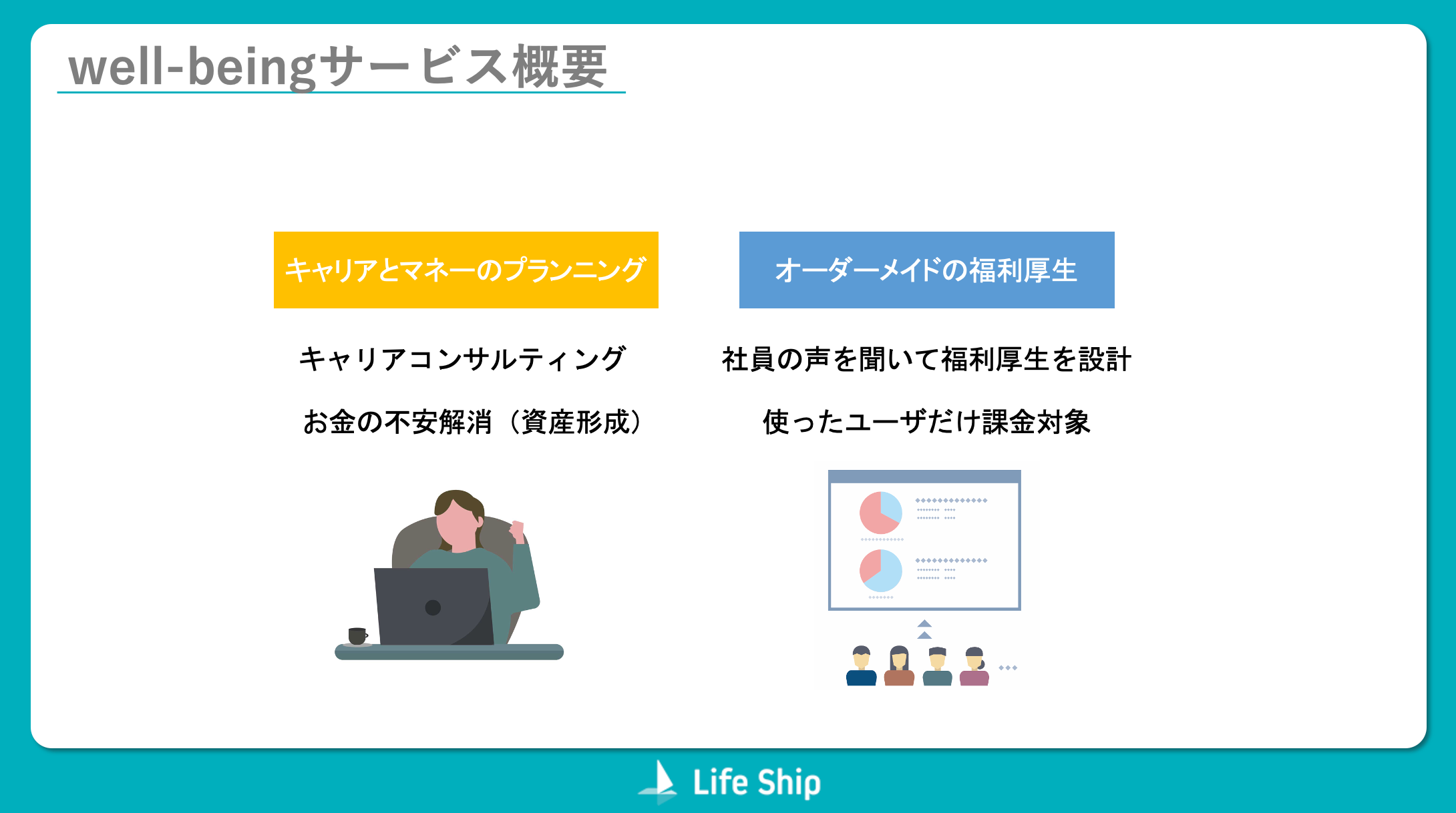 Life Shipのwell-beingサービスは、利用する社員の声を聞いて福利厚生メニューを設計し、“使いたいサービス“を”使ったユーザの分だけ課金対象“となる新しいwell-beingサービスです。