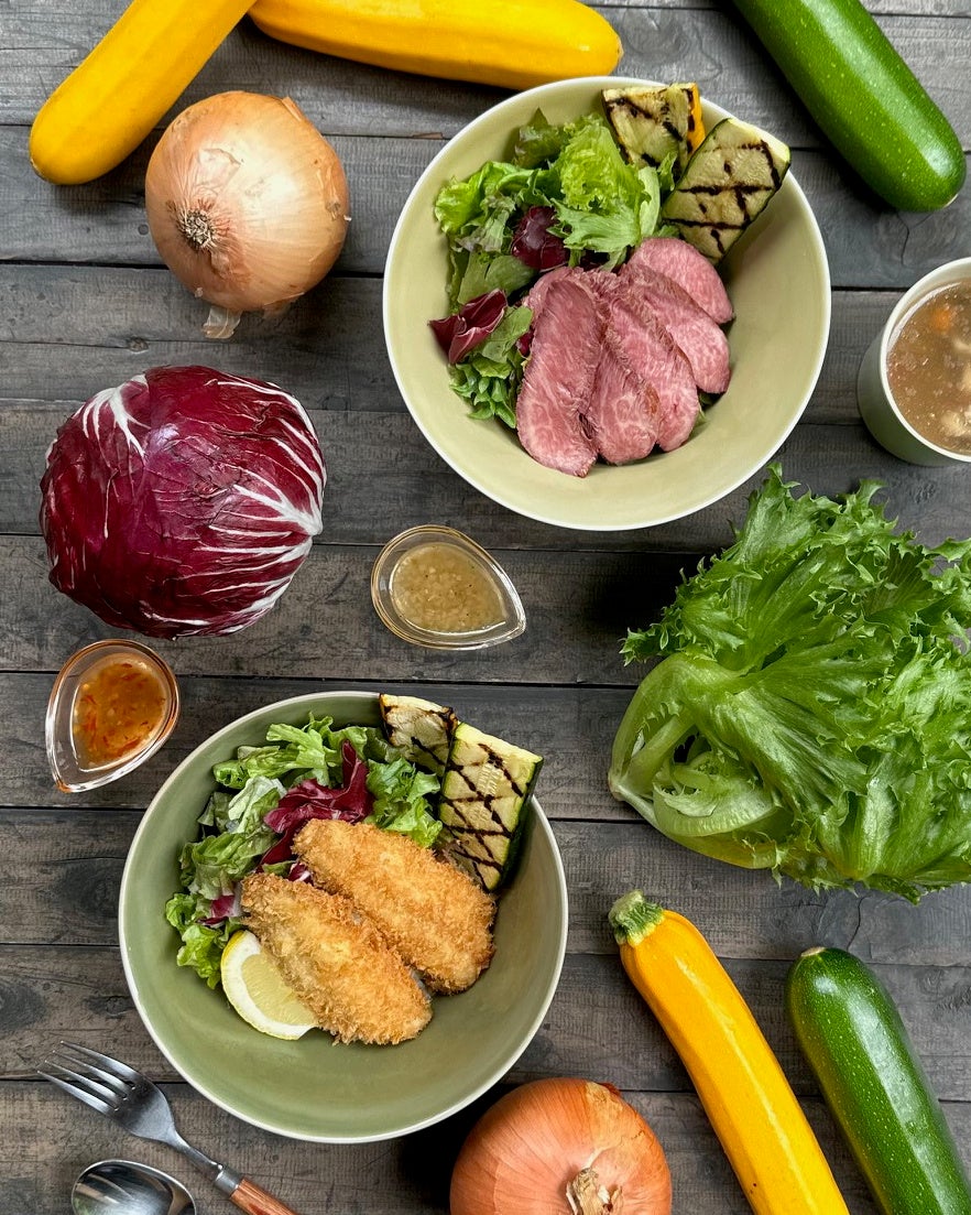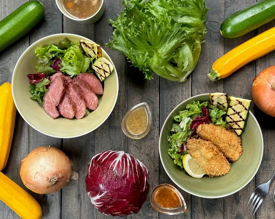 2種類のどんぶりは小田原の野菜をできるだけ使用したサラダ仕立てのどんぶり。ごはんも、白米ではなく玄米を使用し、ビタミンB群やミネラル、食物繊維、たんぱく質など栄養価の高いものに。更にここに小田原産の下中たまねぎやキュウリなどをのせてシャキシャキとした食感をお楽しみいただきながら、夏バテ防止につながるカリウムやミネラルなどの栄養補給を。