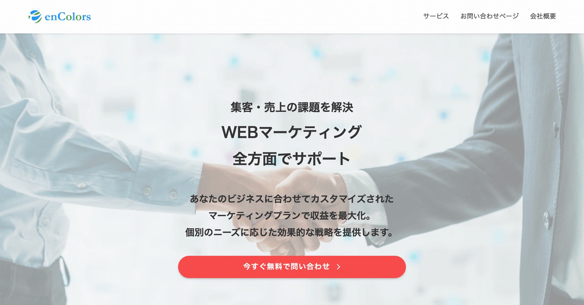 株式会社エンカラーズ(https://encolors.co.jp/)は横浜を拠点とするホームページ制作・SEO対策事業を主とするWEBマーケティング支援会社です。 また、オンライン広告やソーシャルメディアマーケティングなど、幅広いWEBマーケティングの支援も行っています。 当社の目標は、お客様のビジネスの成長をサポートすることです。お客様のニーズや目標を十分に理解し、戦略的なアプローチでウェブマーケティングを展開します。お客様との継続的なコミュニケーションを大切にし、最適なソリューションを提供します。 お客様のビジネスの成功に向けて、当社のプロフェッショナルなチームが全力でサポートいたします。ぜひ一度、お気軽にご相談ください。